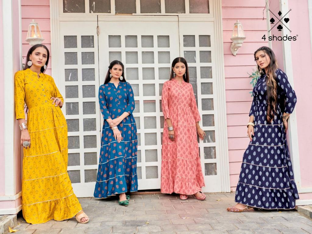 4Shades Sundari Vol 1 By Blue Hills Long Kurtis Gown Catalog, this catalog fabric is Rayon Print and this catalog design are different and fancy print and gown style 52 length Rayon also.