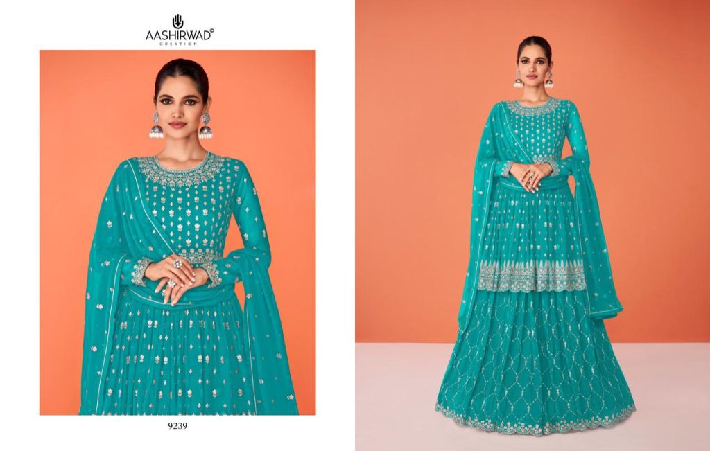 Aashirwad Evershine 9239 Series Georgette Embroidery Designer Wear Salwar Suits,this catalog fabric is real Georgette with fancy embroidery (FREE SIZE STITCH) and skirt fabric is Georgette (FREE SIZE STITCH) and dupatta fabric is Georgette (42 Full Stitch Ulter Upto 44) with designer fancy suits .