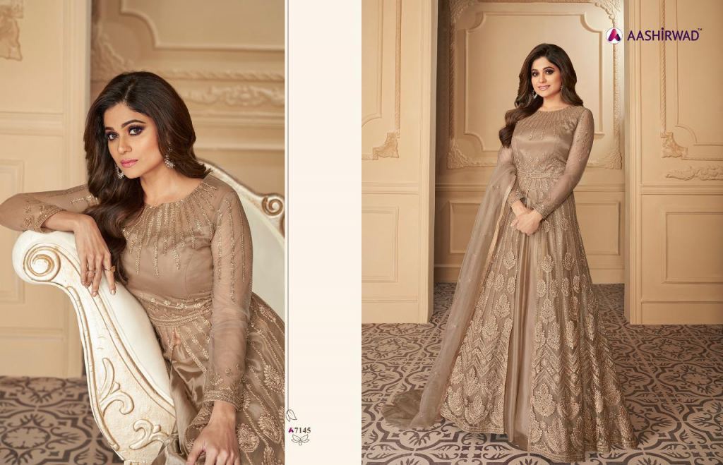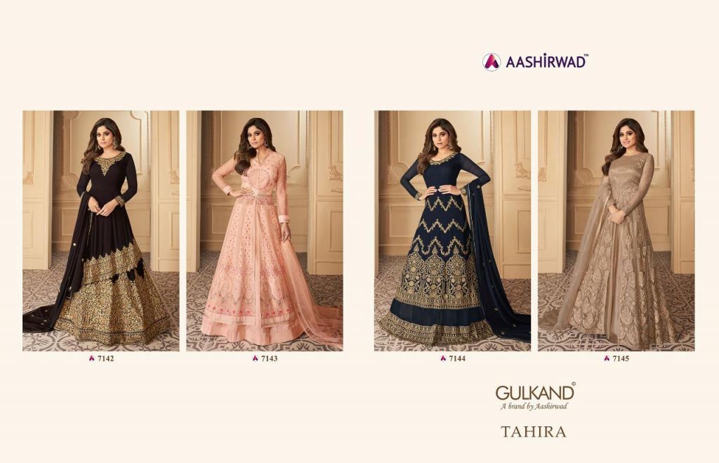 Aashirwad presents Tahira Heavy Wedding Dress Collection,this catlog fabric is mix fabric with different attractive printed design in different colours.