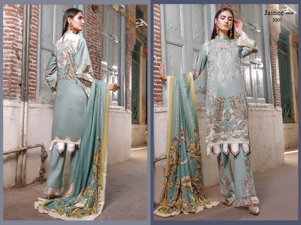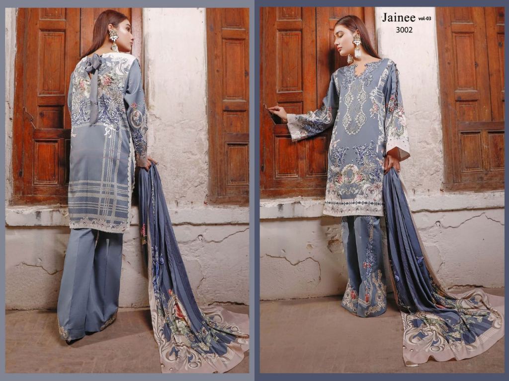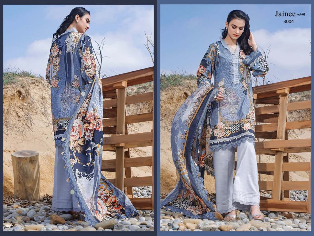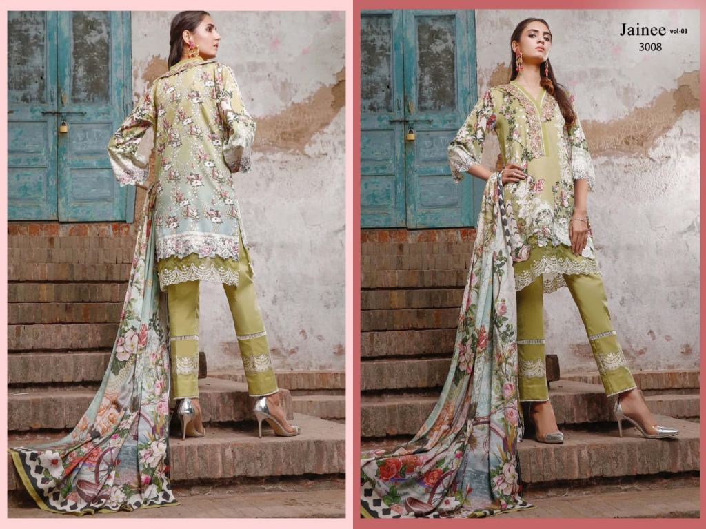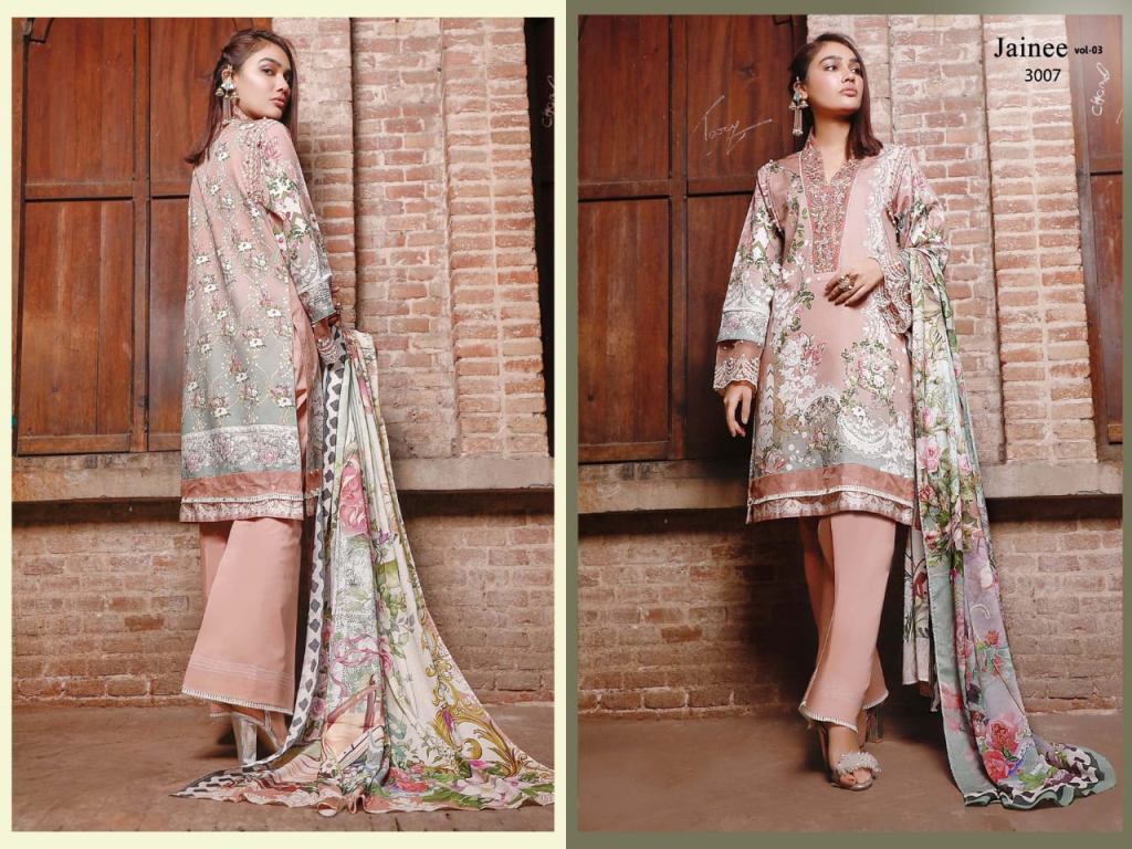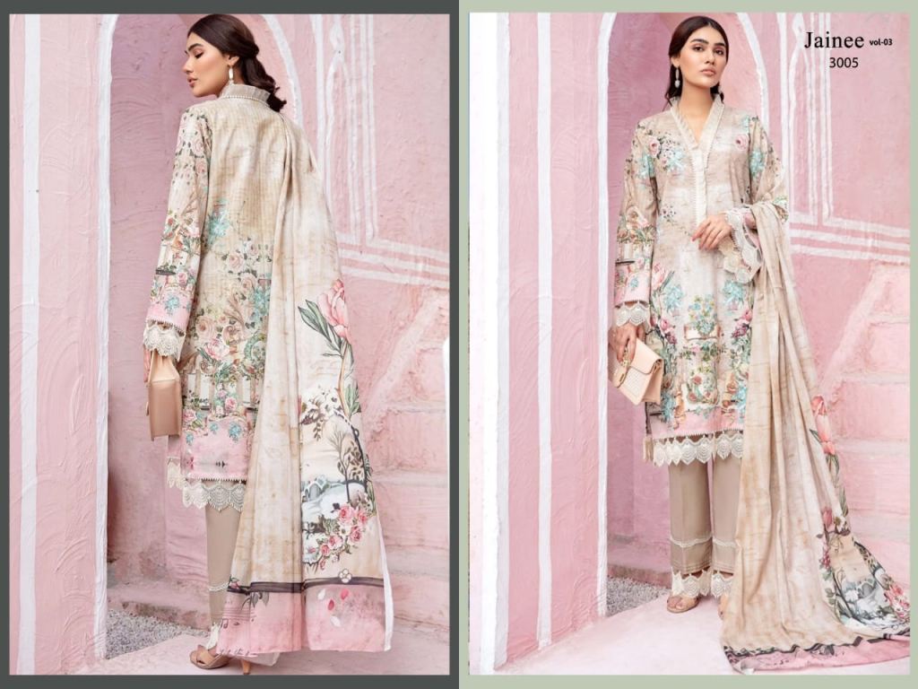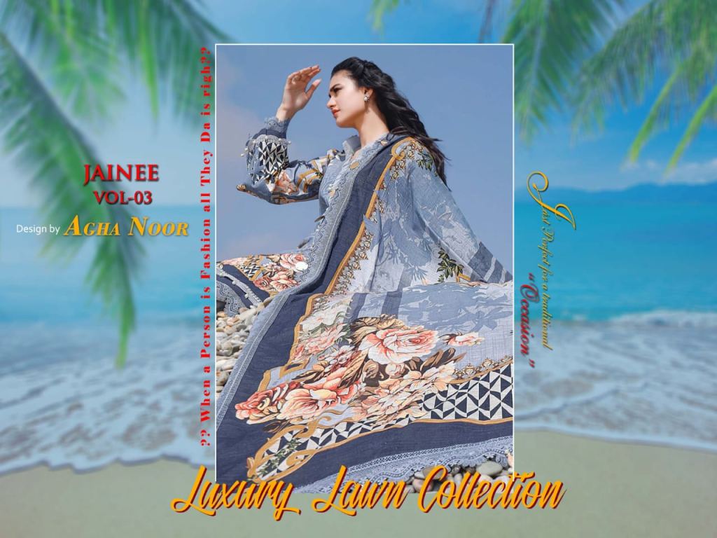Agha Noor Jainee vol 3 catalog Lawn cotton Karachi Dress Material, this catlog fabric is LAWN COTTON (2.40Mtr) and bottom fabric is COTTON (2 Mtr) and dupatta fabric is pure mal mal Lawn Printed (2.25Mtr).