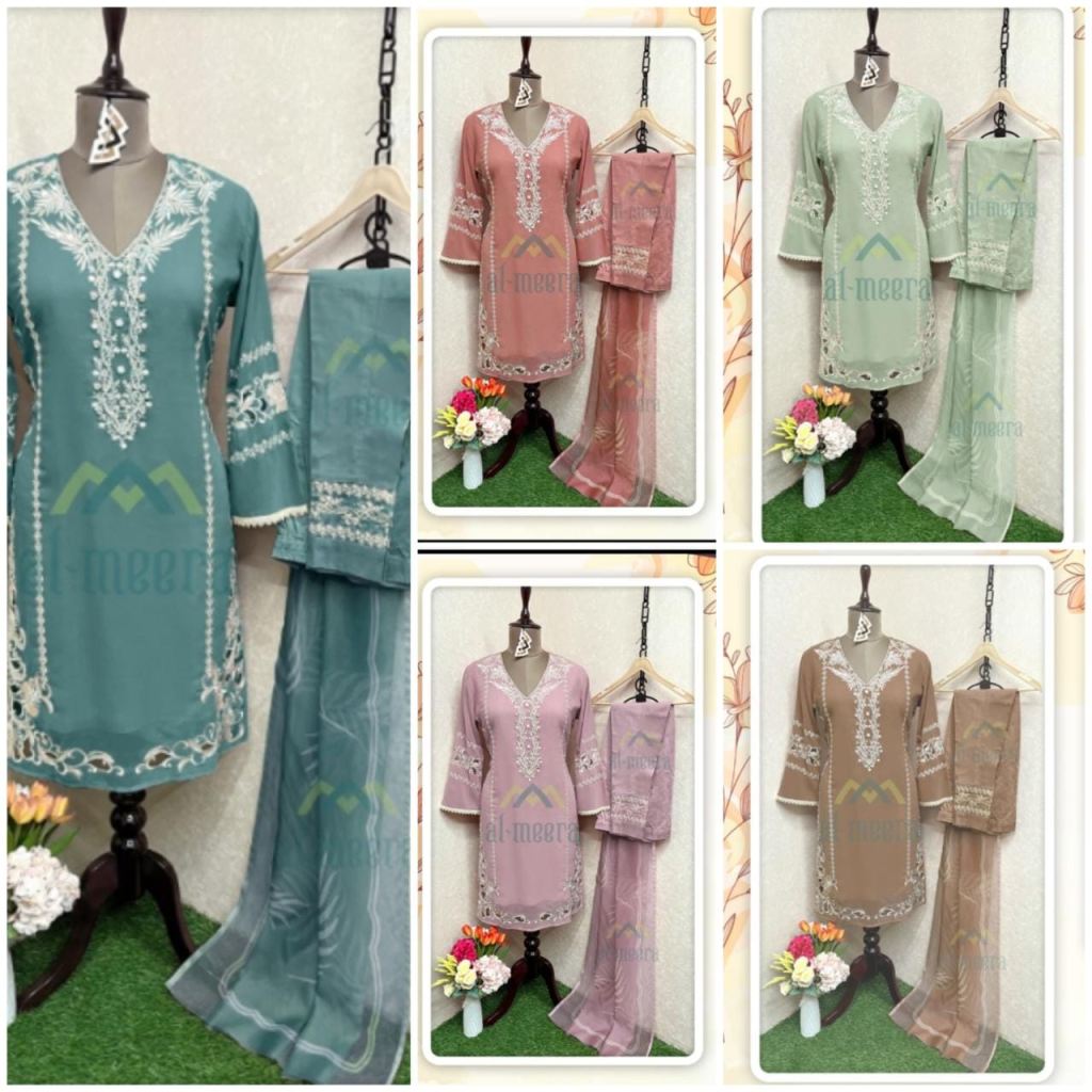 Al Meera 1149 Light Color Readymade Pakistani Suit Collection,thsi catalogue fabric is Faux Georgette With Inner and Bottom fabric is Stretchable Cotten With Embroidered Pach with Dupatta fabric is Digitally Printed Organza.