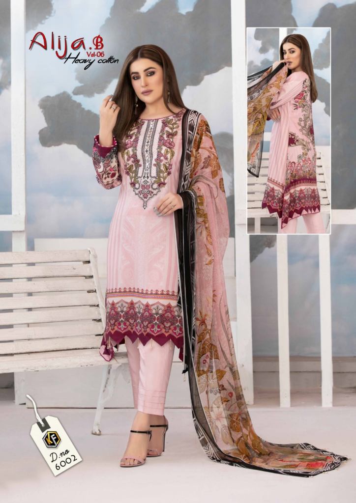 Alija B vol 6 Karachi Dress Material Collection, this catalog fabric is Heavy cotton print with a total of six designs and this catalog is top, bottom with dupatta is cotton and attractive printed design in different colors.