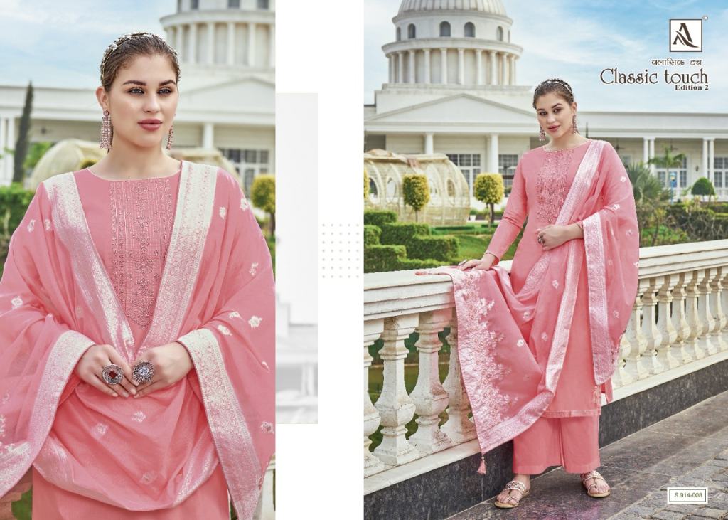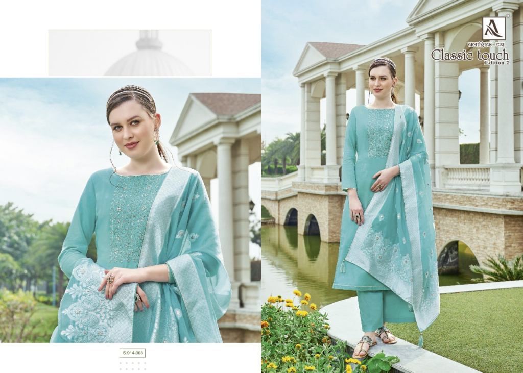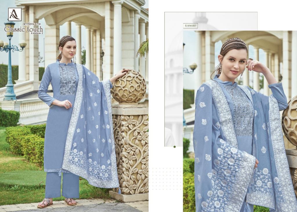 Alok Classic Touch catalog Jam Cotton Designer Dress Material, this catlog fabric is Pure Zam Cotton Dyed with Lucknowi Thread Work & Swarovski Diamond Bottom: Pure Cotton Dyed Solid Dupatta: Pure Hand Weave Lucknowi Pallu Dup with Four Side Piping Lace & Tassels.
