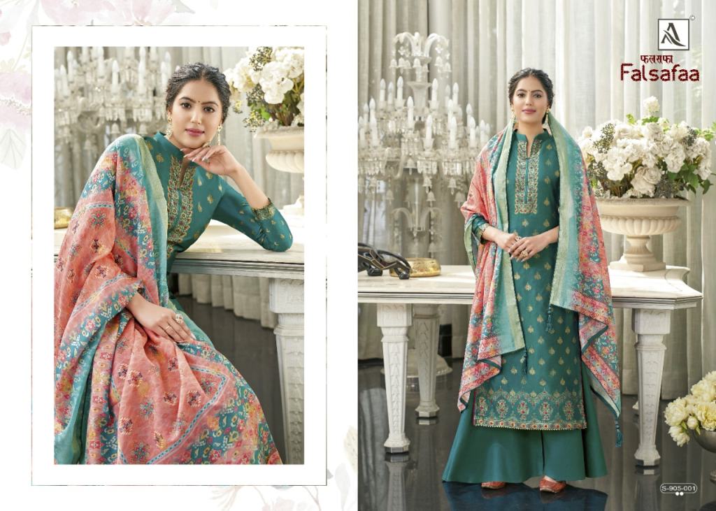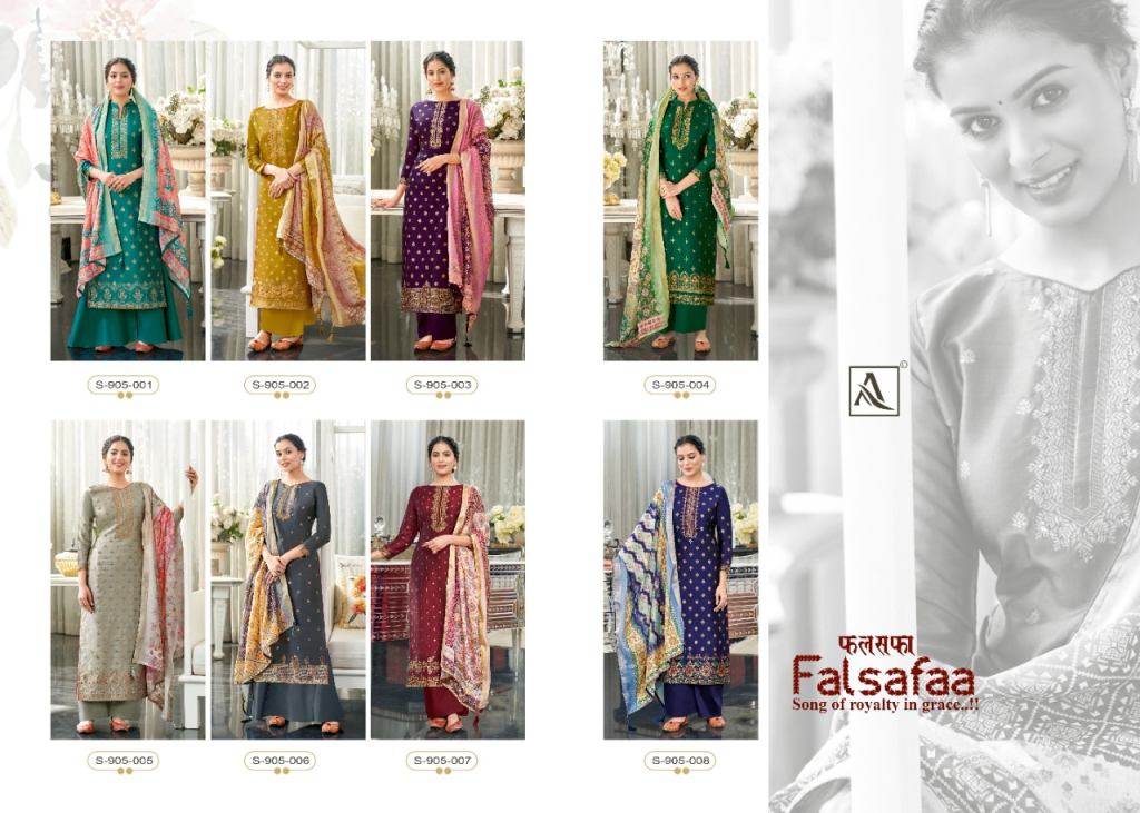 Alok Falsafaa catalog Designer Dress Materials, this catalog fabric is Pure Viscose Designer Jacquard With Elegant Khatali Work | Bottom: Pure Dull Santoon Dyed | Dupatta: Pure Banarasi Soft Feel Box Pallu Digital Print With Piping Lace.