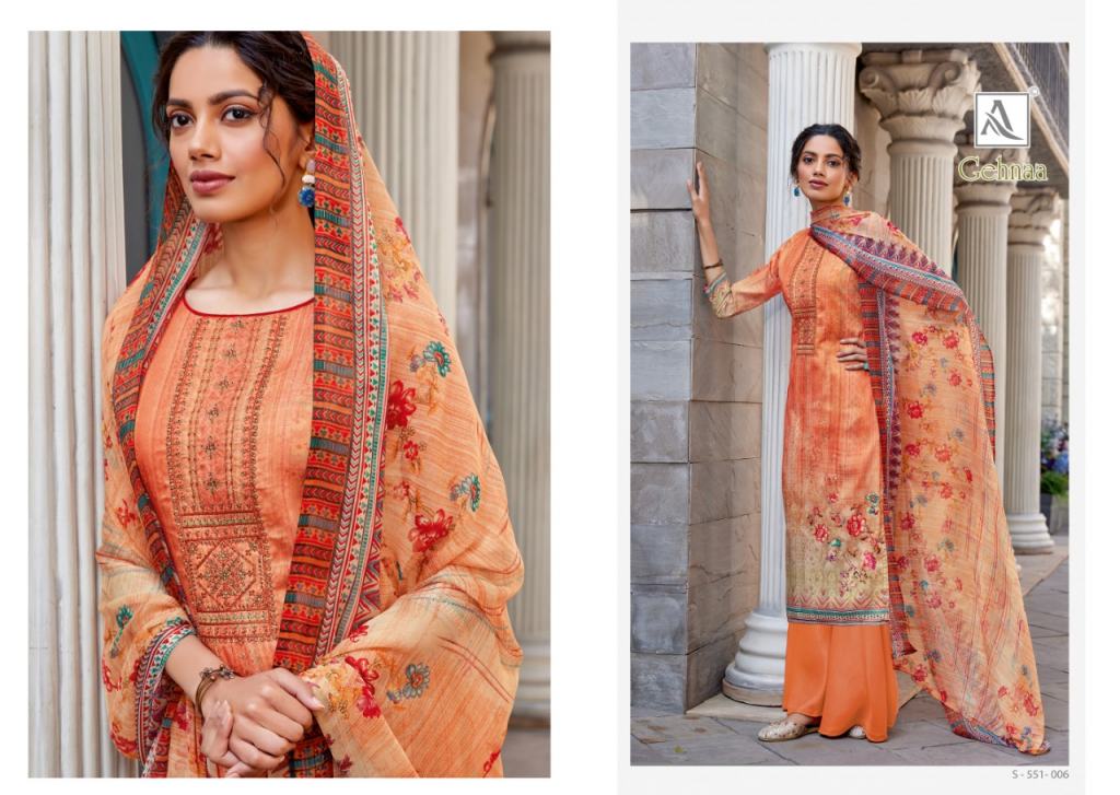 Alok Gehnaa Dress Materials - Jam Cotton Suit Manufacturer from Surat, this catalog top fabric is Pure Zam Digital Cotton Print with Exclusive Embroidery and Swarovski Diamond and bottom fabric is Pure Cotton Dyed and dupatta fabric is Pure Nazneen Chiffon Print Dupatta also.