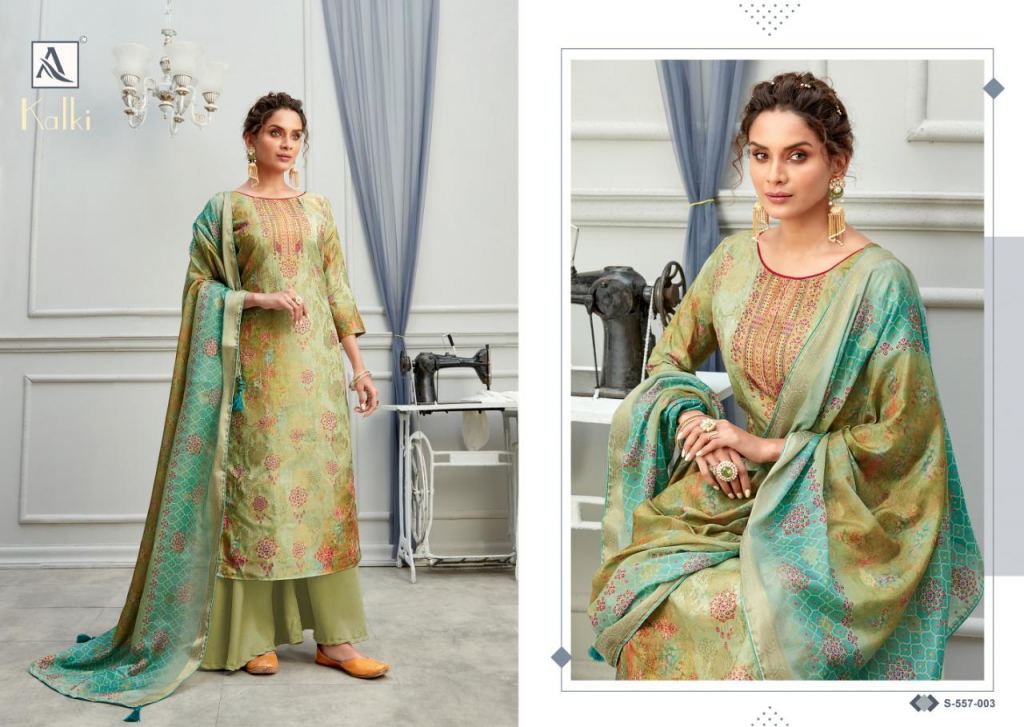 Alok presents Kalki Casual Wear Printed Designer Dress Material Collection, this catalog top is Banarasi Jacquard with fancy Digital Print with Swarovski diamond work and the bottom is Dull Santoon and dupatta is Dola Banarasi Jacquard fancy Digital Print Box Pallu Dupatta.