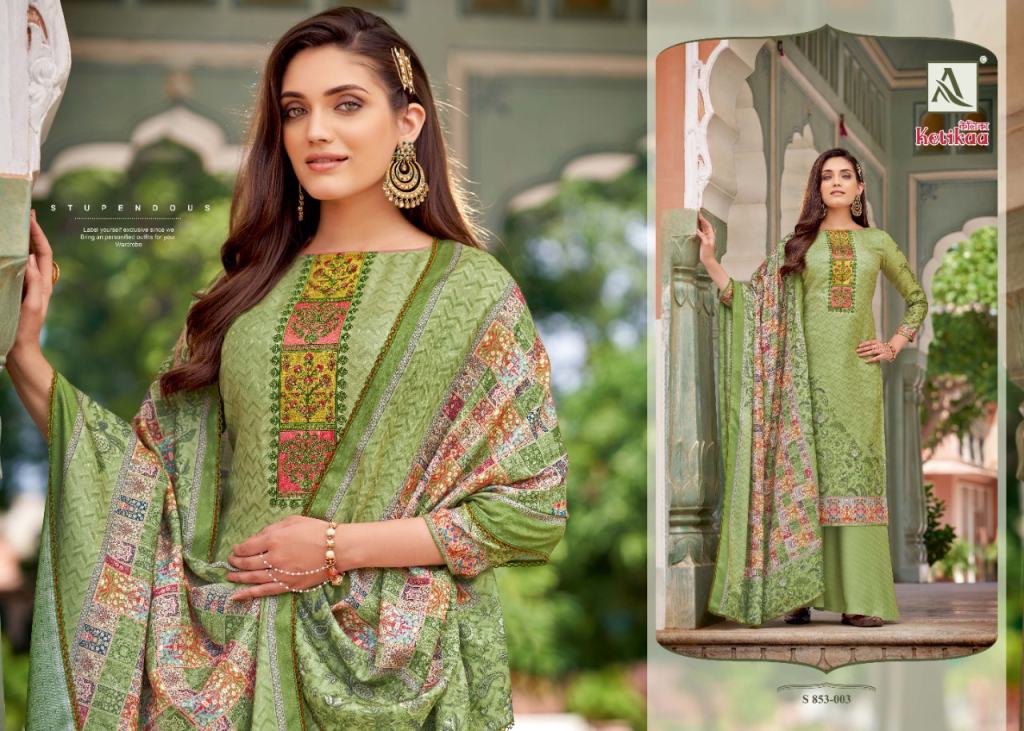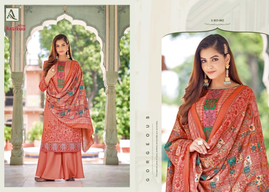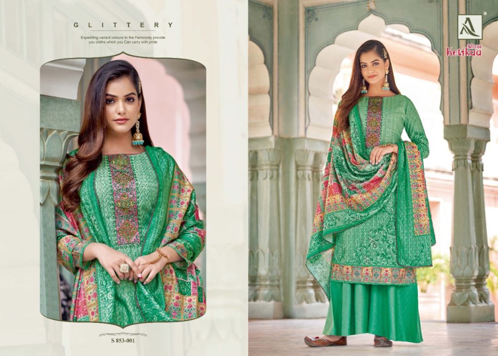 Alok Ketikaa Winter Wear Digital Printed Pashmina Catalog, this catalog fabric is Pure Wool Pashmina Digital Print with Embroidery and Swarovski Diamond | Bottom: Pure Wool Pashmina Solid | Dupatta : Pure Wool Pashmina Digital Print Dup with Four Side Lace.