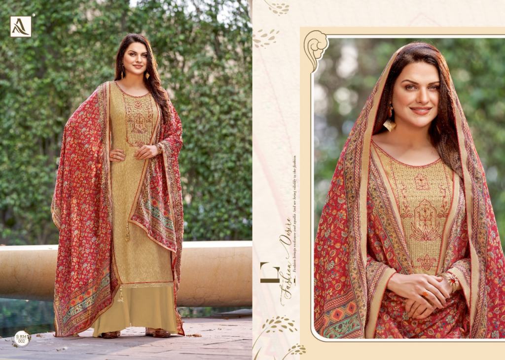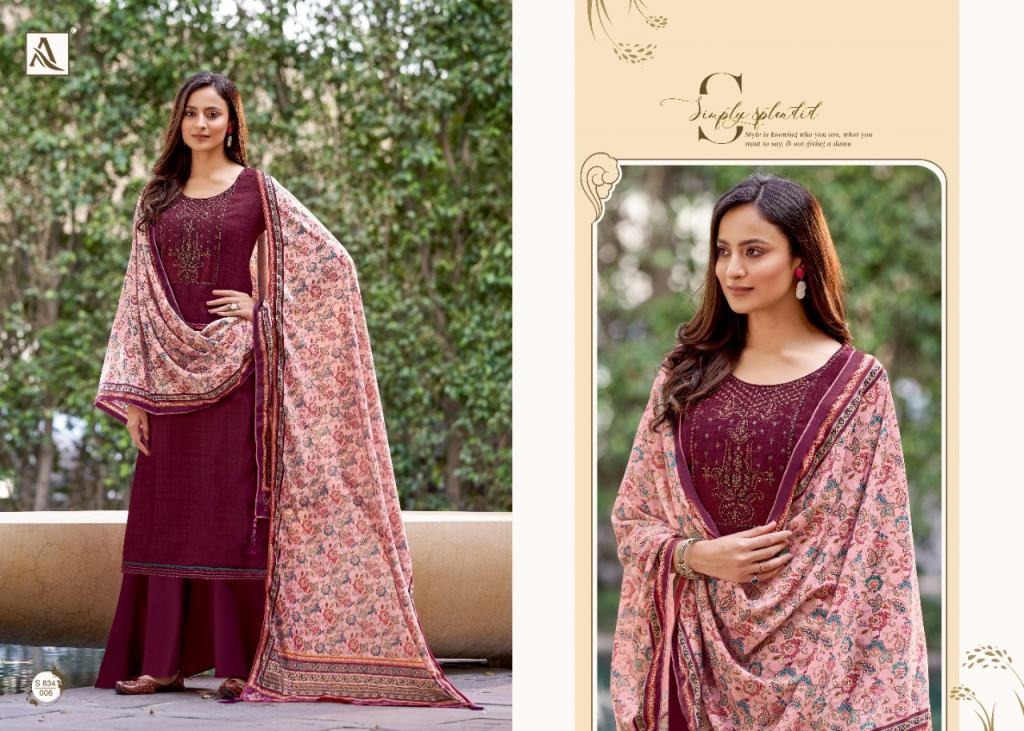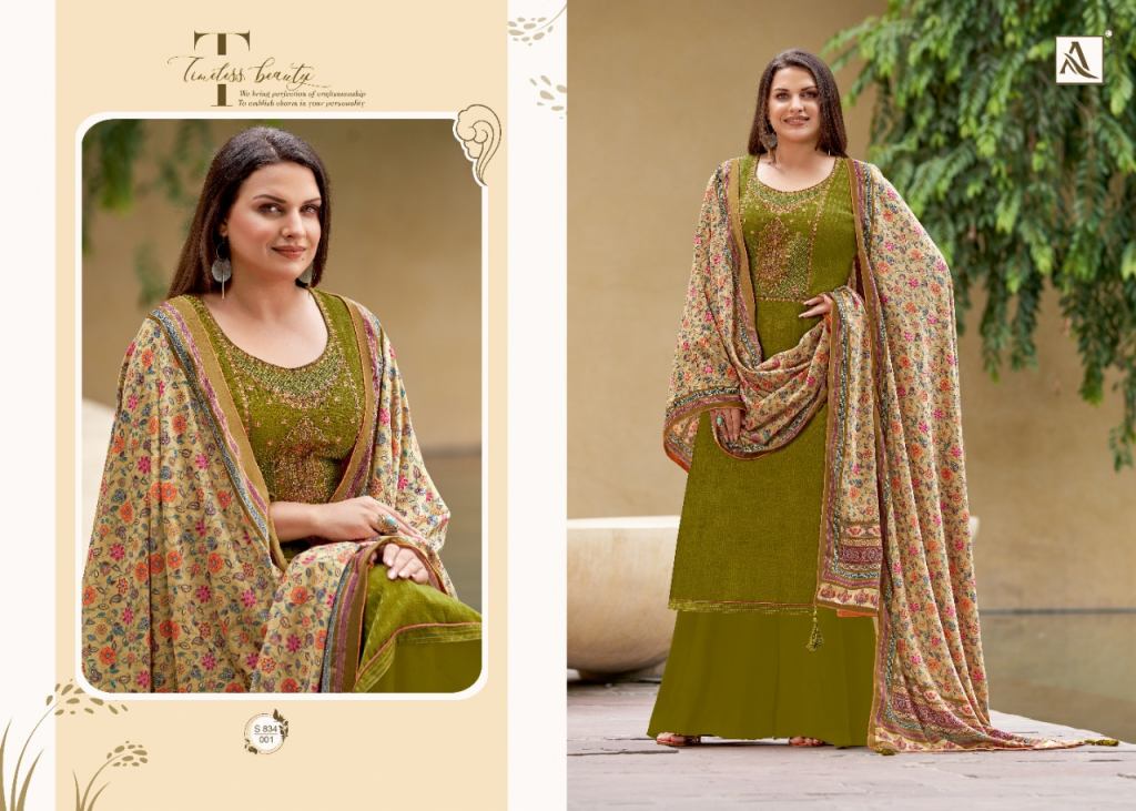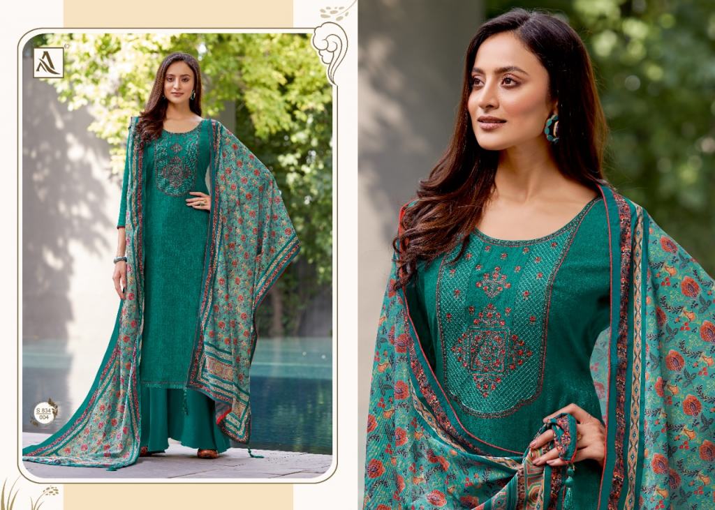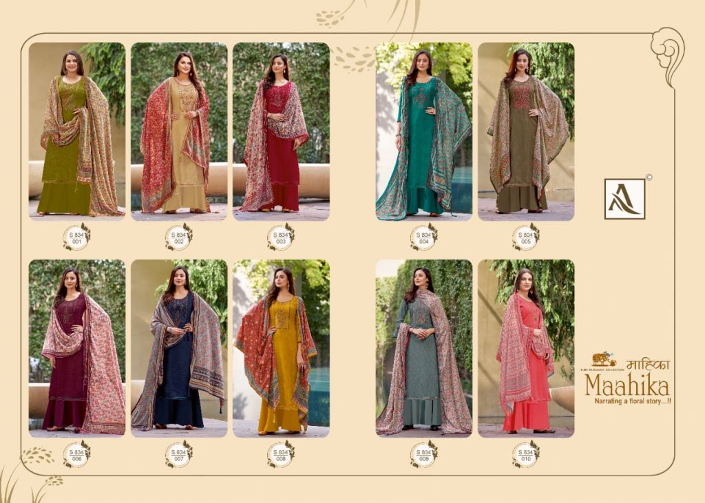 Alok Mahikaa Winter Wear Wool Pashmina Catalog, this catalog fabric is Pure Wool Pashmina Self Print with Kashmiri Embroidery | Bottom: Pure Wool Pashmina Solid | Dupatta: Pure Viscose Velvet Digital Box Pallu Print Dup with Four Side Piping Lace & Tassels.