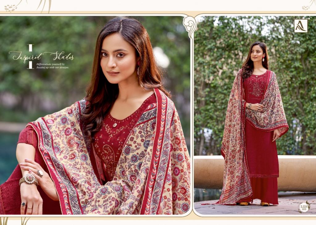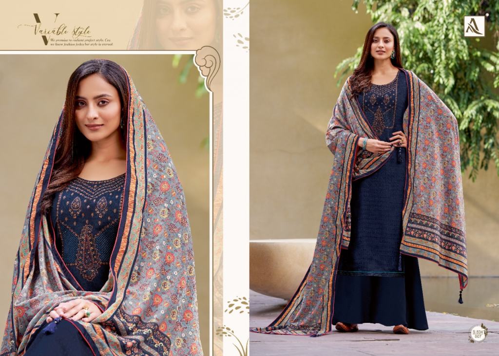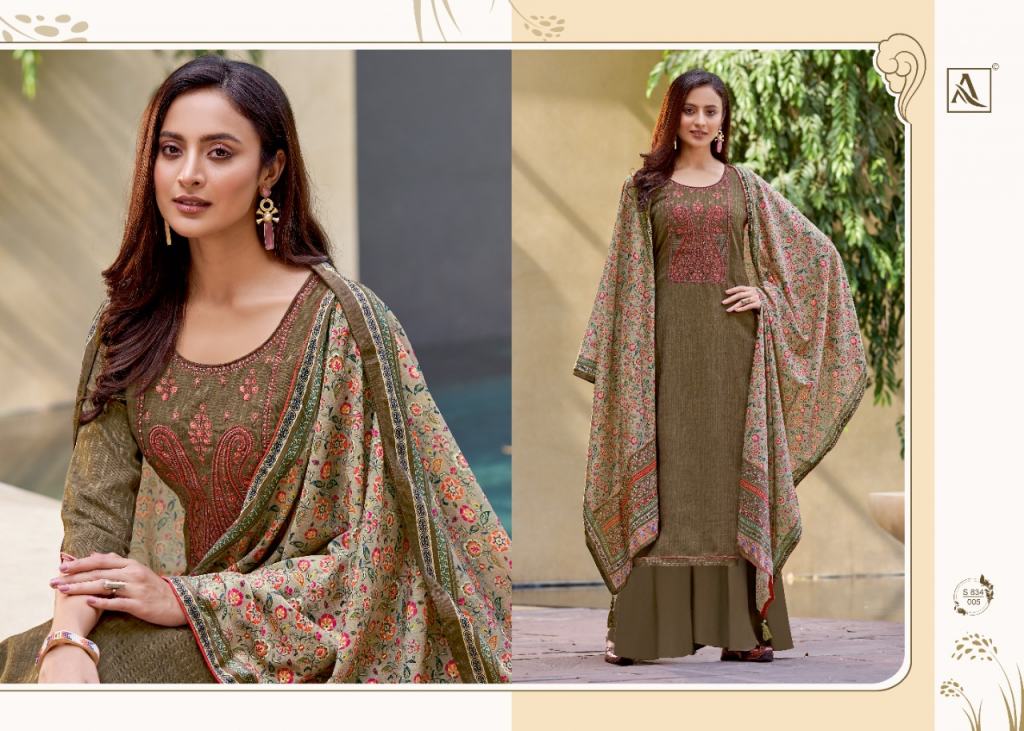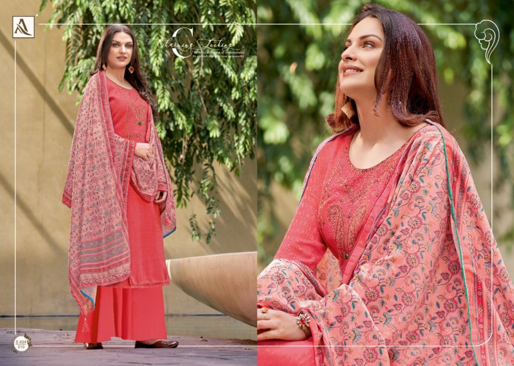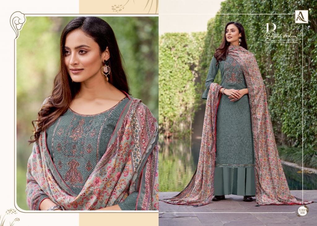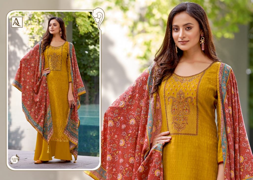Alok Mahikaa Winter Wear Wool Pashmina Catalog, this catalog fabric is Pure Wool Pashmina Self Print with Kashmiri Embroidery | Bottom: Pure Wool Pashmina Solid | Dupatta: Pure Viscose Velvet Digital Box Pallu Print Dup with Four Side Piping Lace & Tassels.