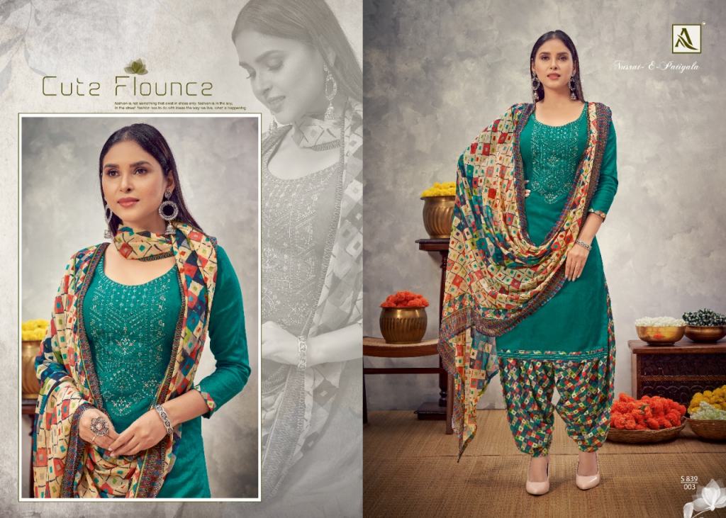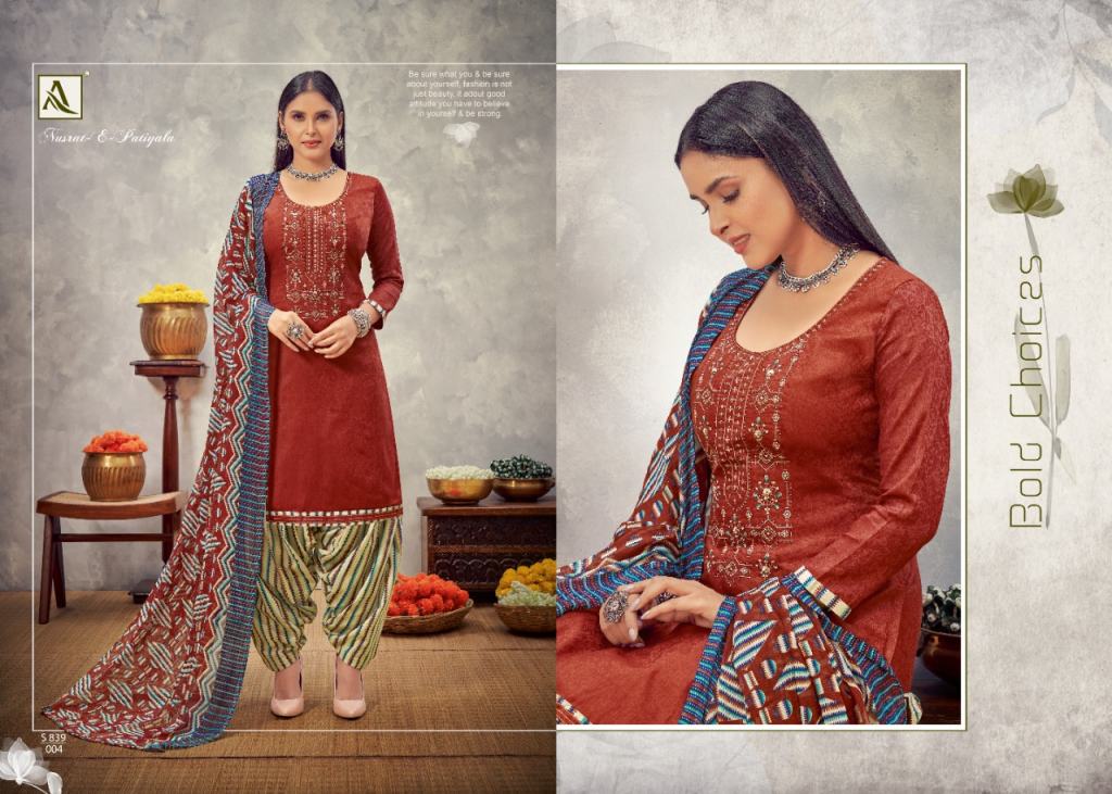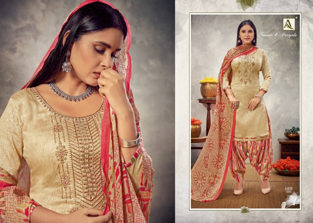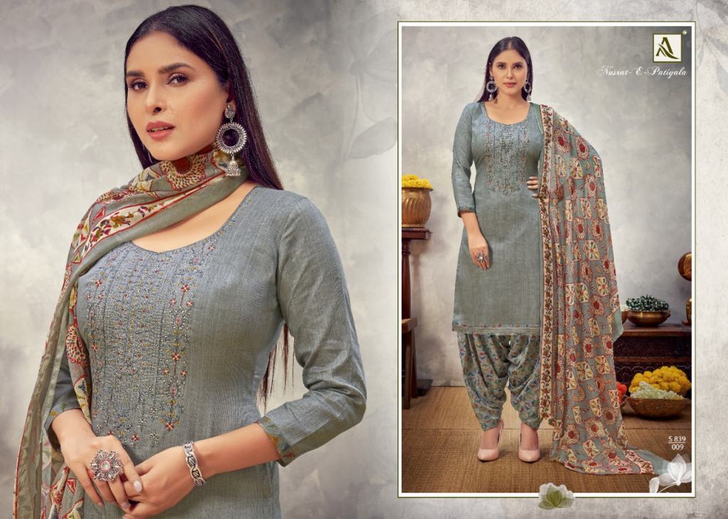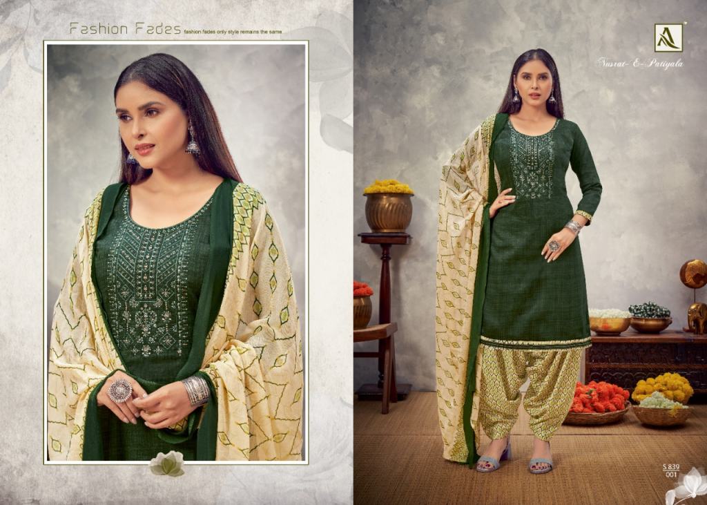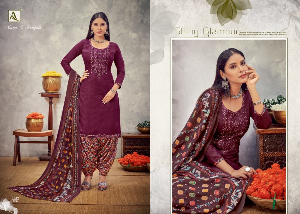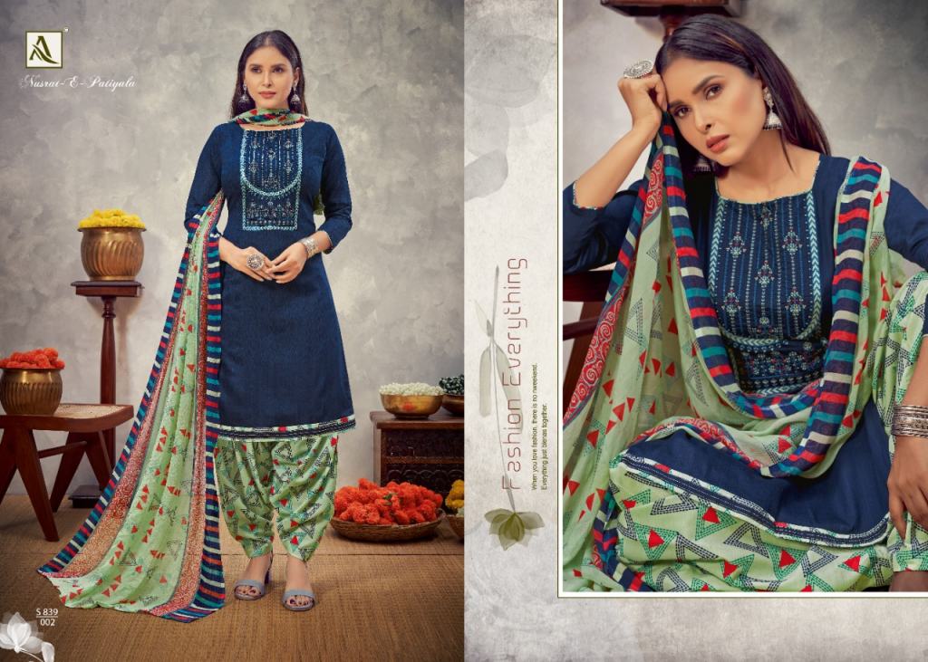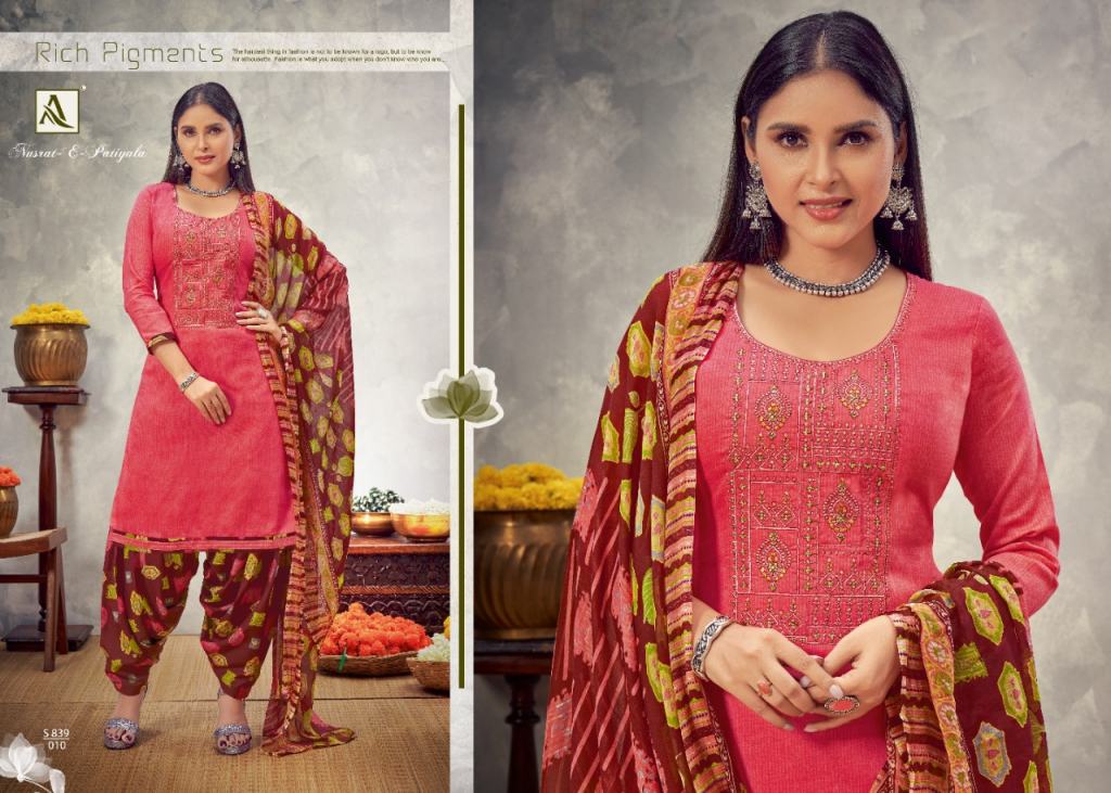 Alok Nusrat E Patiyala vol 8 Jam Cotton Designer Dress Material catalog, this catalog fabric is Pure Zam Cotton Negative Print with Embroidery | Bottom: Pure Soft Cotton Digital Style Patiyala Print | Dupatta: Pure Nazneen Chiffon Print with Four Side Lace.