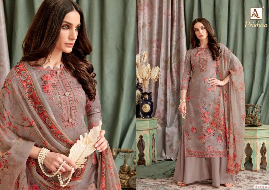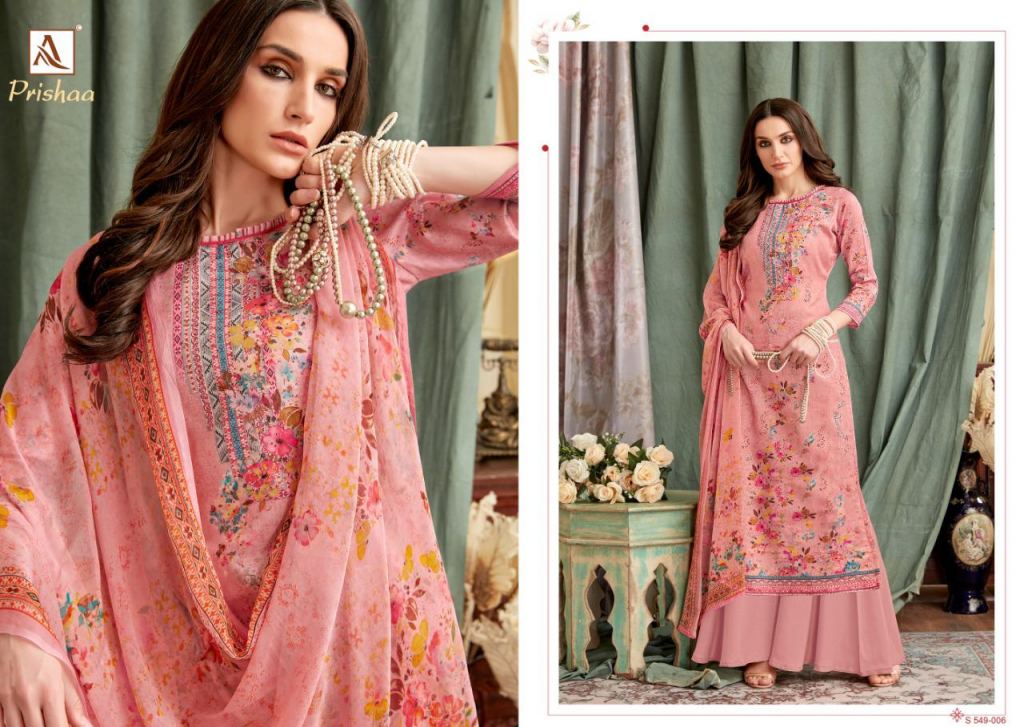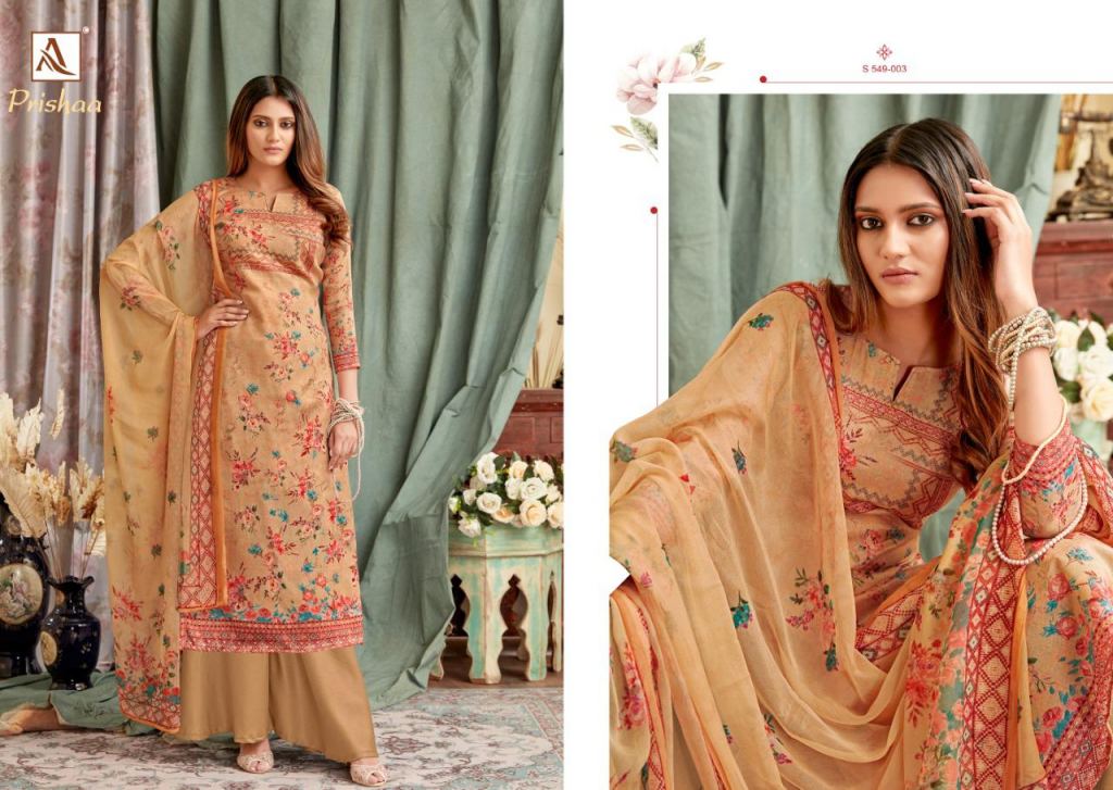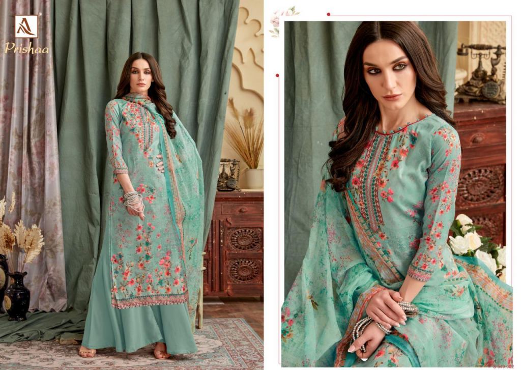 Alok presents Prishaa Printed Dress Material, this catalog top is Pure Cotton Jam fancy Digital Print with attractive Swarovski Diamond Work (Cut 2.50mtr) with the bottom is Pure Cotton Solid (Cut3.00mtr) and dupatta is Pure Bemberg Chiffon Box Pallu Print dupatta (Cut2.25mtr).