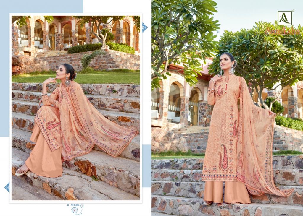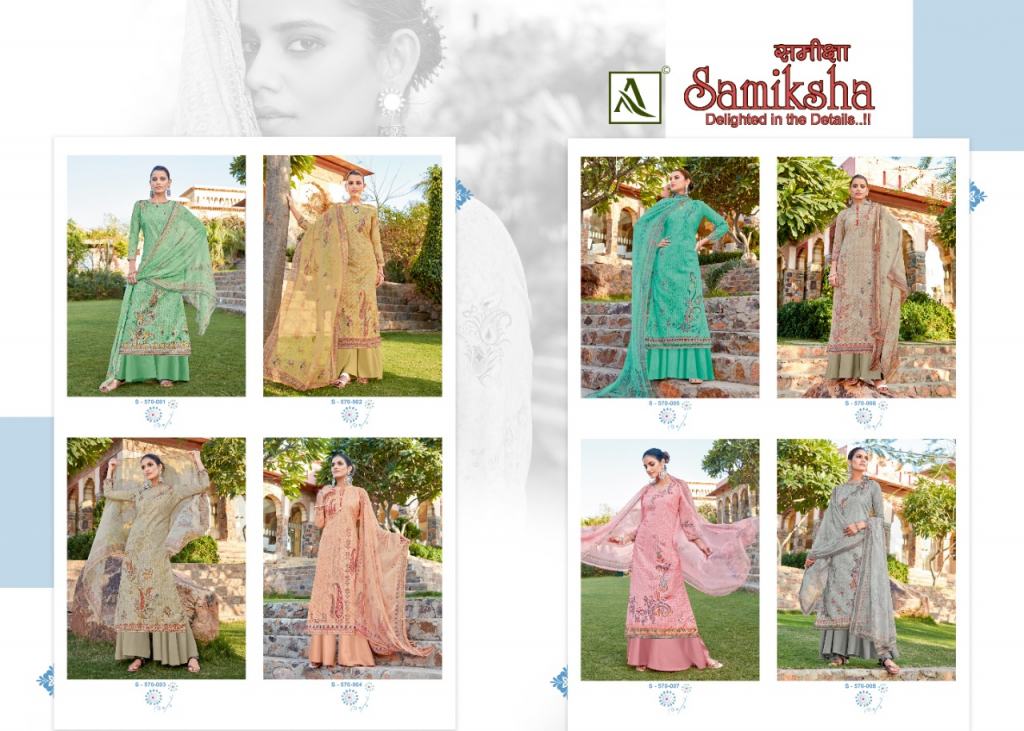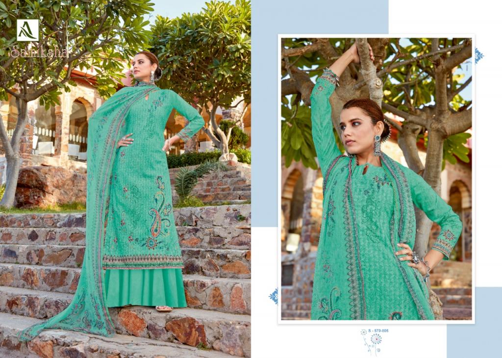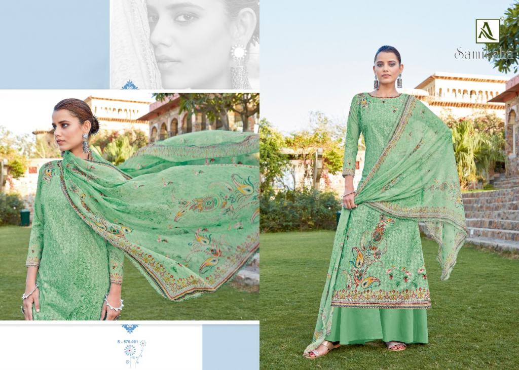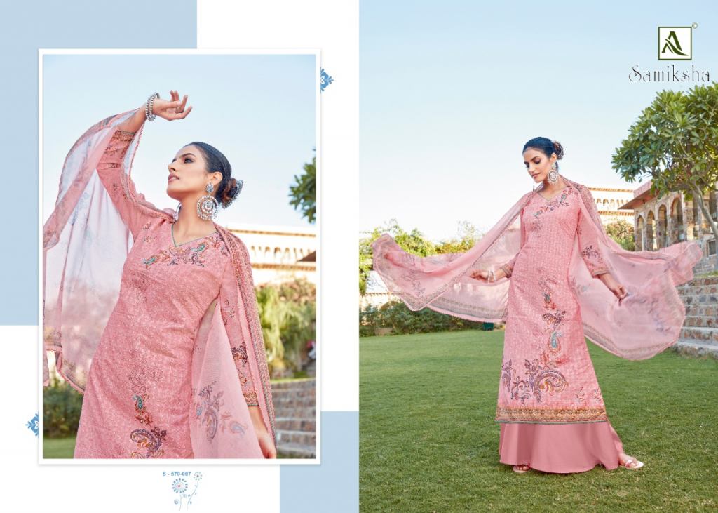 Alok Samiksha Designer Dress Market, this catalog top fabric is Pure Cotton Self chiffli work with Digital Print and this catalog bottom fabric is Pure Cotton Dyed with dupatta fabric is Pure Nazneen Chiffon Digital Print box pallu Dupatta and catalog are amazing colors with different designs and catalog are super hit dress online market.