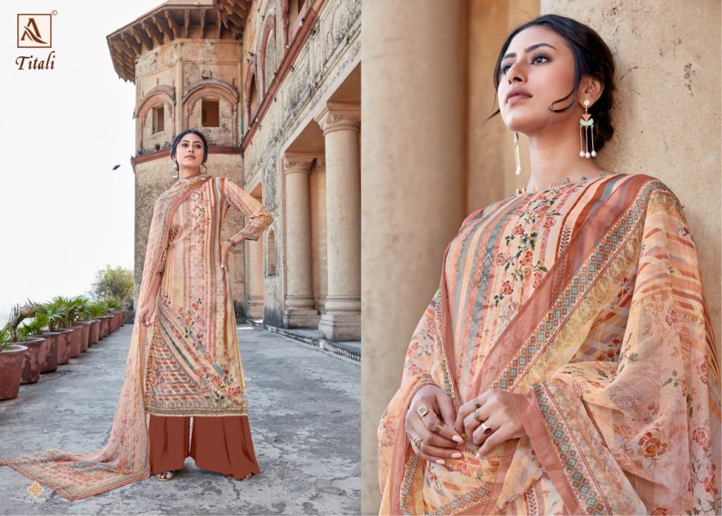 Alok Titali Ethinc Wear Designer Printed Salwar Kameez catalog, this catalog top fabric is Top-Pure Zam Satin Digital Print with Swarovski Diamond | Bottom-Pure Cotton Solid | Dupatta-Pure Nazneen Chiffon Digital Print.