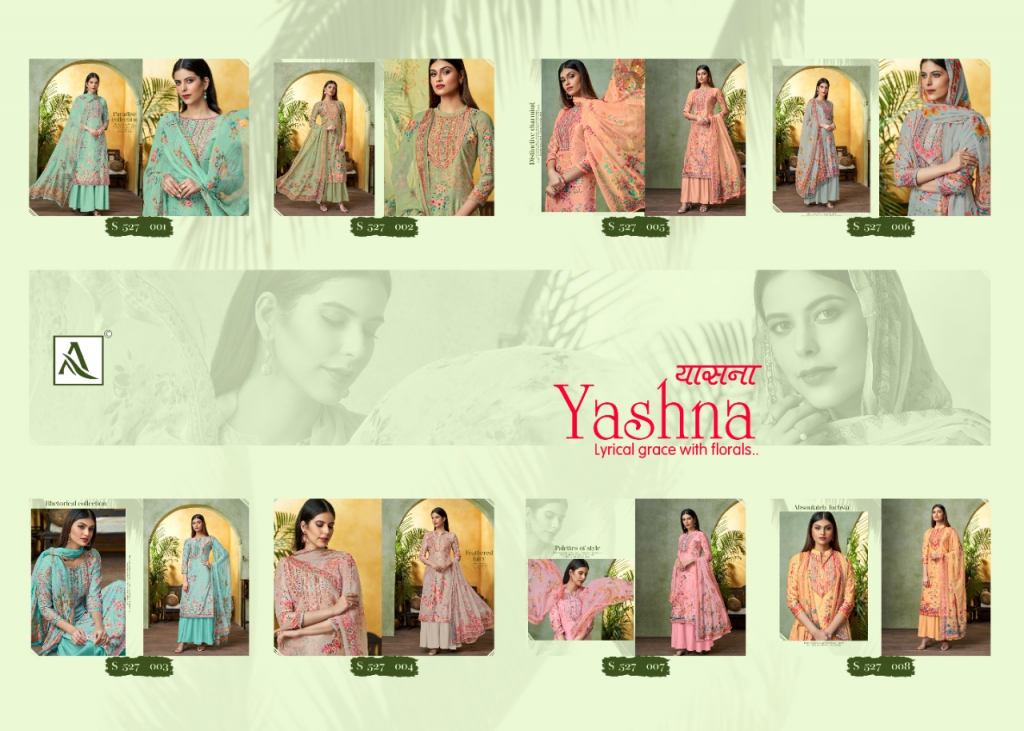 Alok presents Yashna Designer Dress Material, this catalog top is Pure Cotton Jam fancy Digital Print with Swarovski Diamond Work and bottom is Pure Cotton Solid and dupatta is Pure Chiffon Digital Print Box Pallu with Four Side Lace and designs are styles.