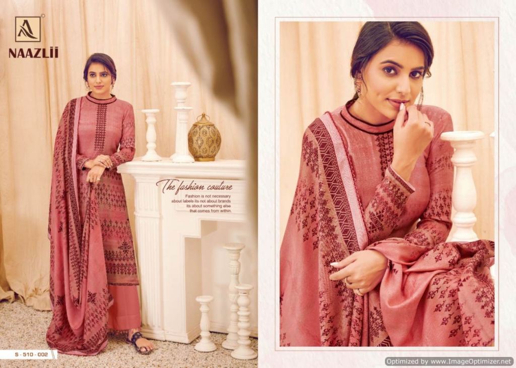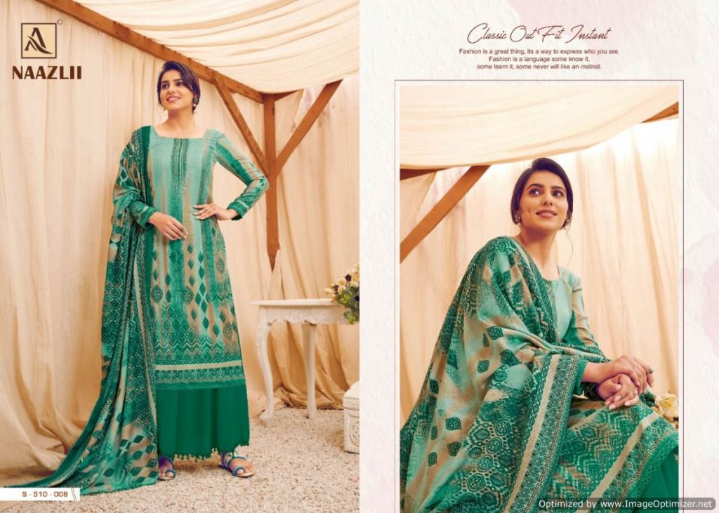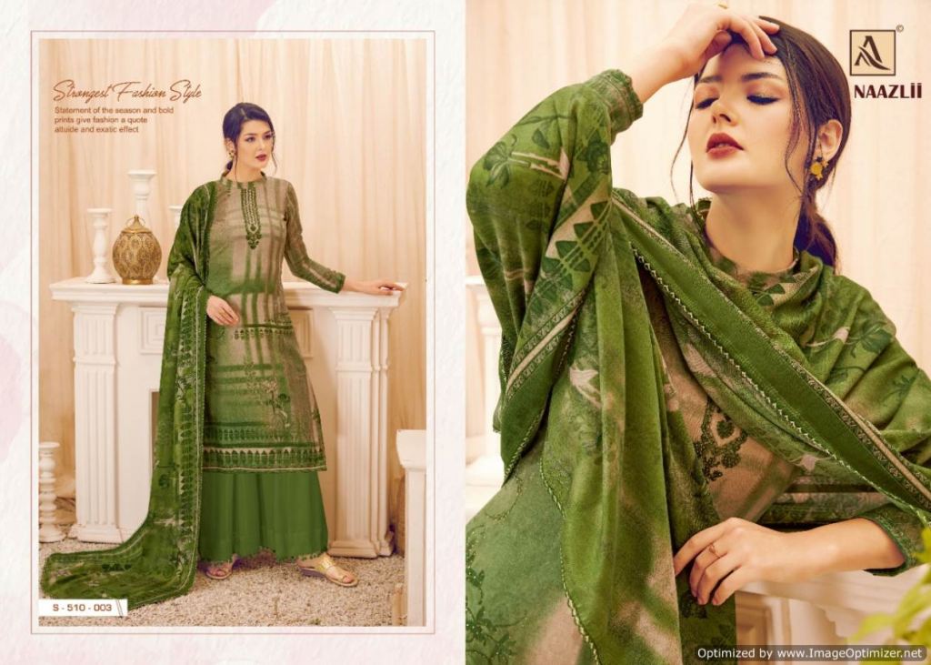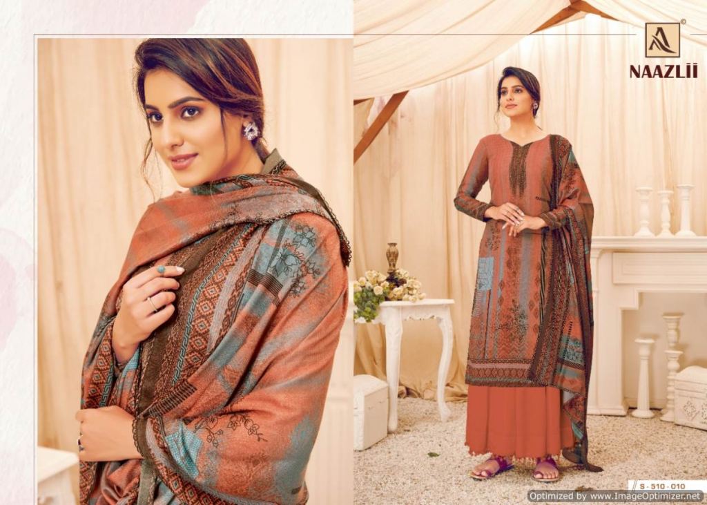 Alok presents Naazlii Designer Dress Material,this index is in the texture of pashmina . this assortment is a sum of the different ten various designs and shading. this list all are distinctive shading and designs too,this catlog top is pashmina with Digital Print with Swarovsk and Diamond Work withjh bottom are Pure Wool Pashmina Solid and dupatta are Pure Wool Pashmina Print