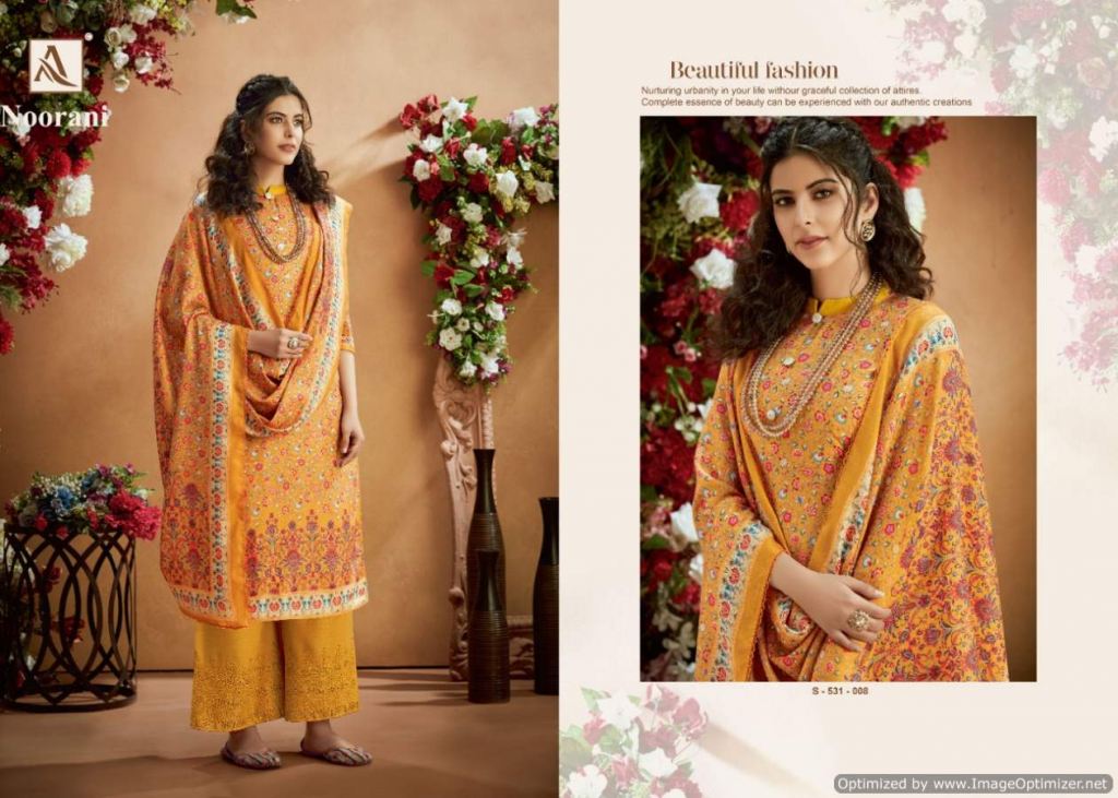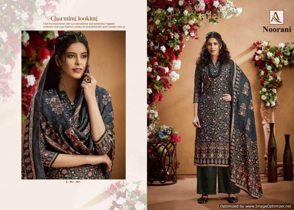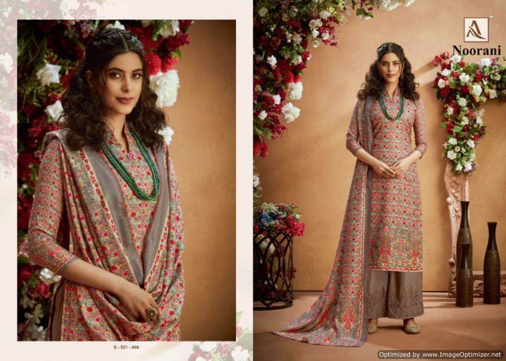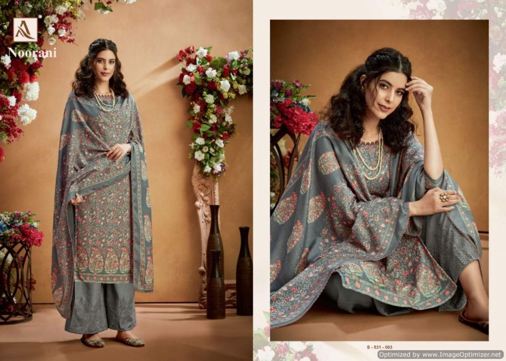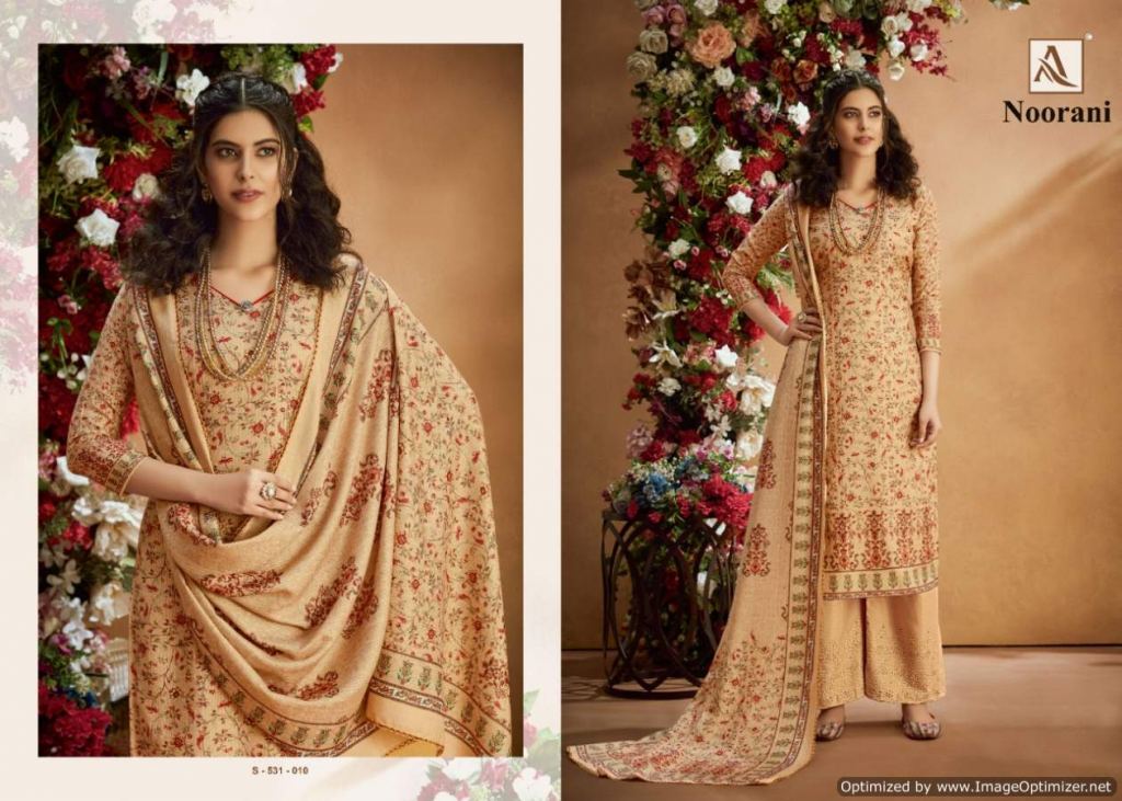 Alok presents Noorani Winter Collection, this catalog total ten designs, and this catalog work is amazing with Top fabric is Pure Wool Pashmina Digital Print with Swarovski Diamond Work, and the Bottom with Pure Wool Pashmina Chiffli Embroidery Plazzo Solid and Dupatta is Pure Wool Pashmina Digital Print With Four Side Lace.