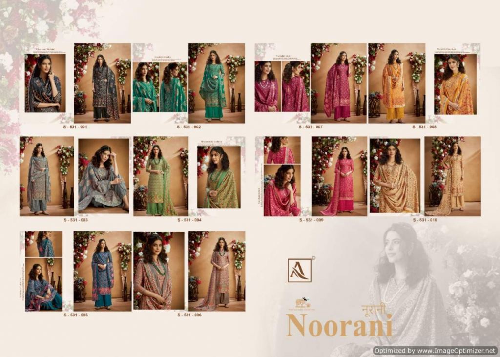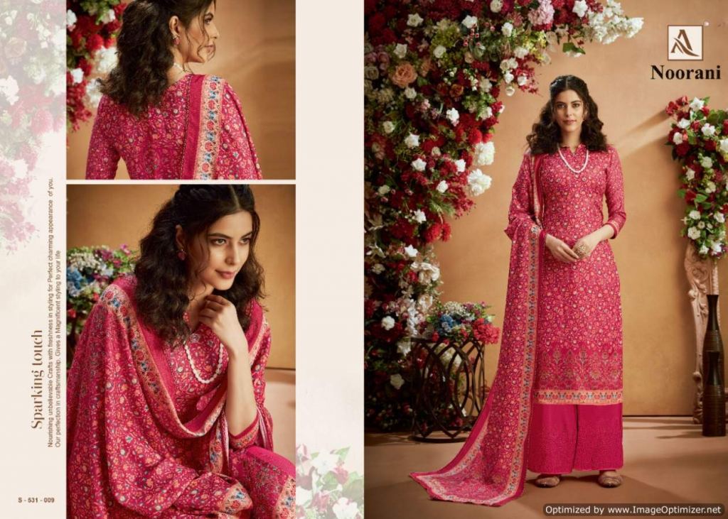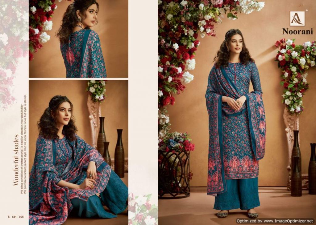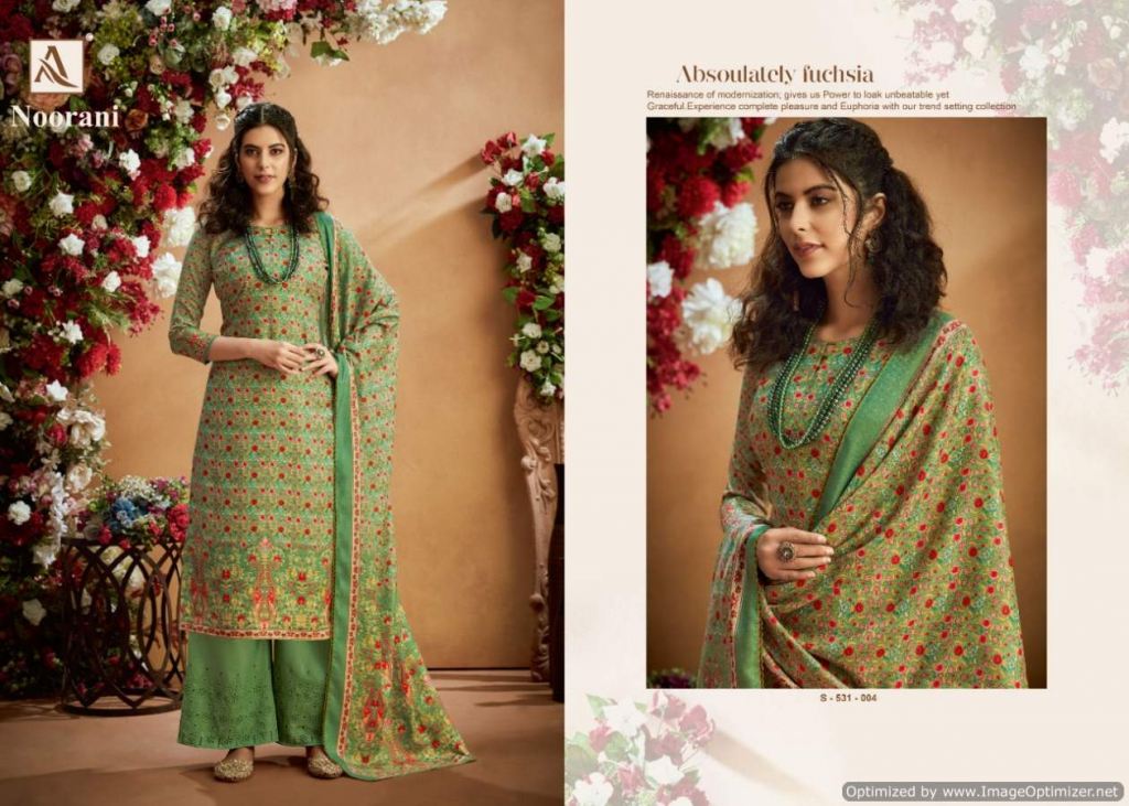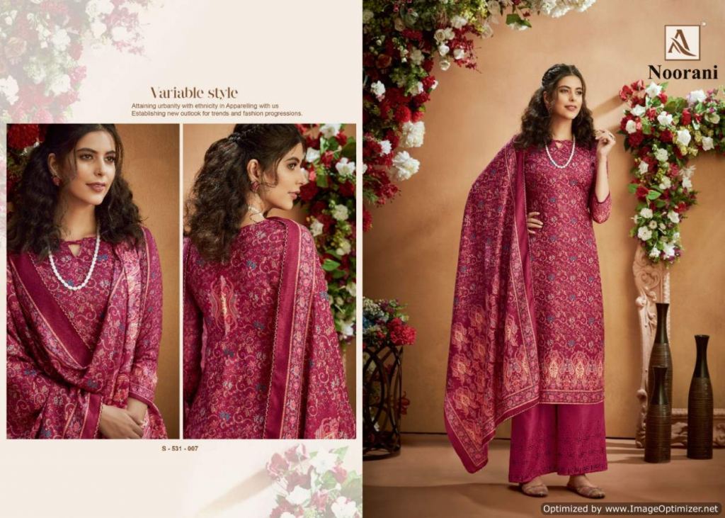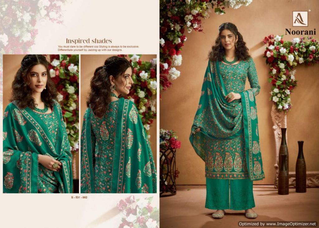 Alok presents Noorani Winter Collection, this catalog total ten designs, and this catalog work is amazing with Top fabric is Pure Wool Pashmina Digital Print with Swarovski Diamond Work, and the Bottom with Pure Wool Pashmina Chiffli Embroidery Plazzo Solid and Dupatta is Pure Wool Pashmina Digital Print With Four Side Lace.