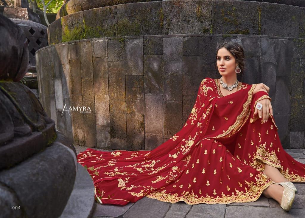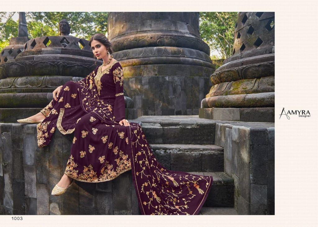 Amyra presents celebrity Designer Salwar Suits,this catalog fabric is Georgette with heavy exclusive embroidery with fancy diamond also.