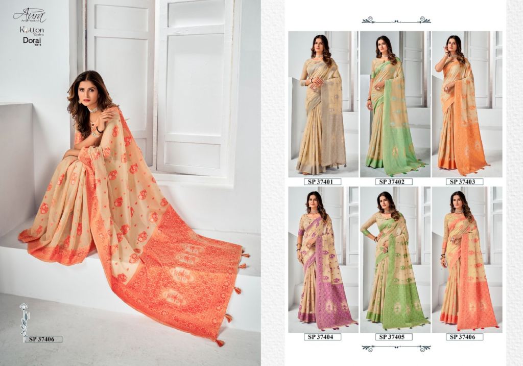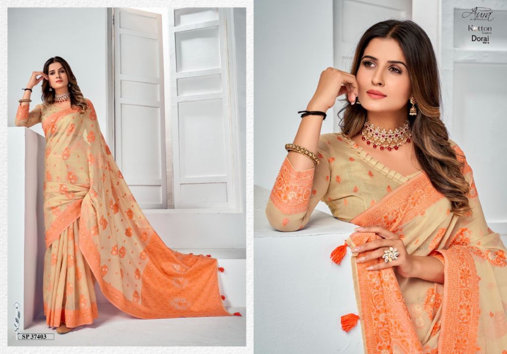 Aura Dorai Vol 4 Regular Wear Cotton Printed Saree Collection. In this catalog saree fabric is soft cotton with exclusive pattern on all over saree and unstitched blouse pcs.