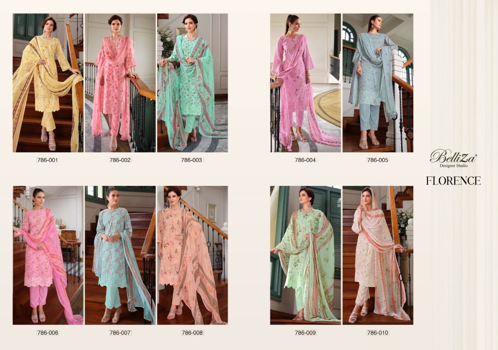 Belliza Florence Cotton Linen Digital Printed Dress Material Collection. This catalog top fabric is cotton linen Digital printed with heavy daman embroidery & boring work, bottom fabric is cotton and nazmin chiffon digital printed dupatta.