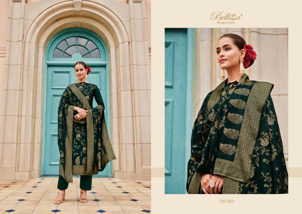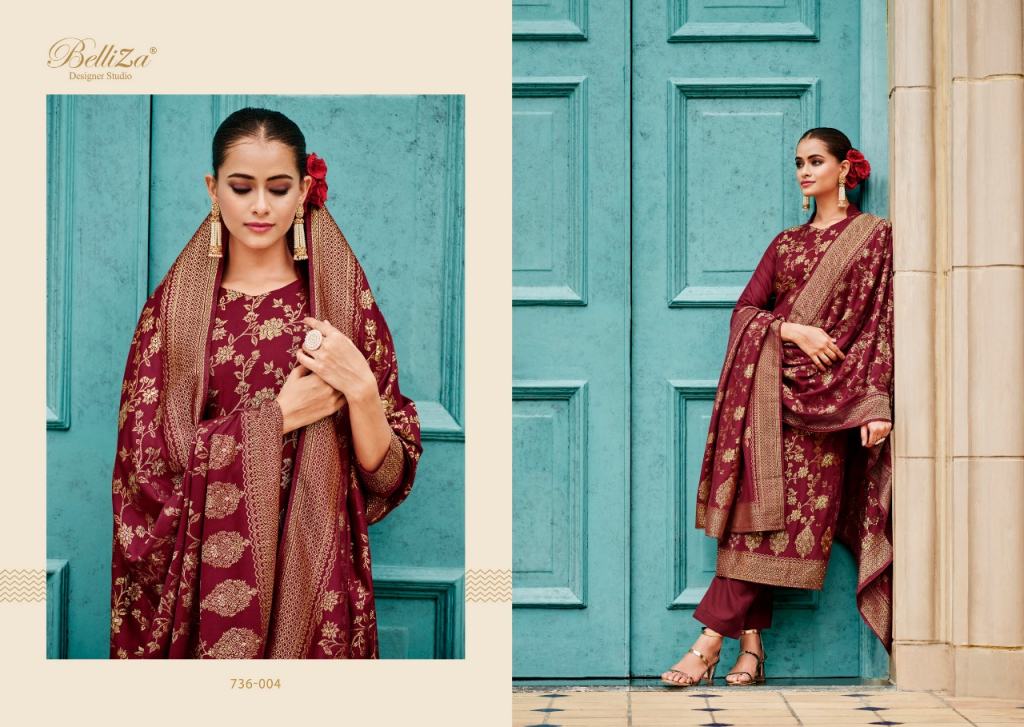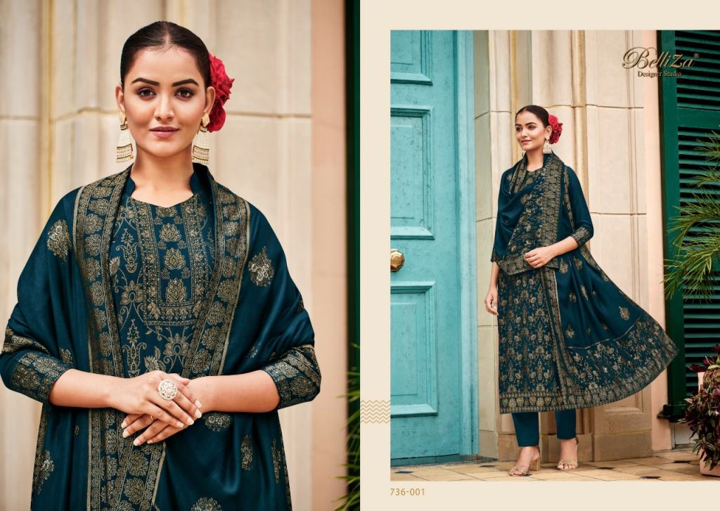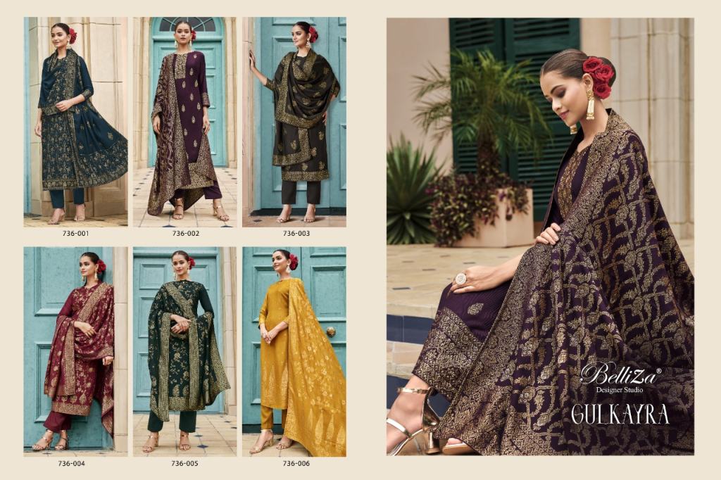 Belliza Gulkayra Viscose Pashmina Dress Material Buy Winter season special collection, this catlog fabric is 100% Pure Heavy Viscose Pashmina Weaving Jacquard with handwork (2.50 mtrs apx) and Dupatta are 100% Pure Heavy Viscose Pashmina Weaving Jacquard Shawl (2.30 mtrs apx) with bottom fabric is 100% Pure Pashmina Salwar (3 mtrs apx).