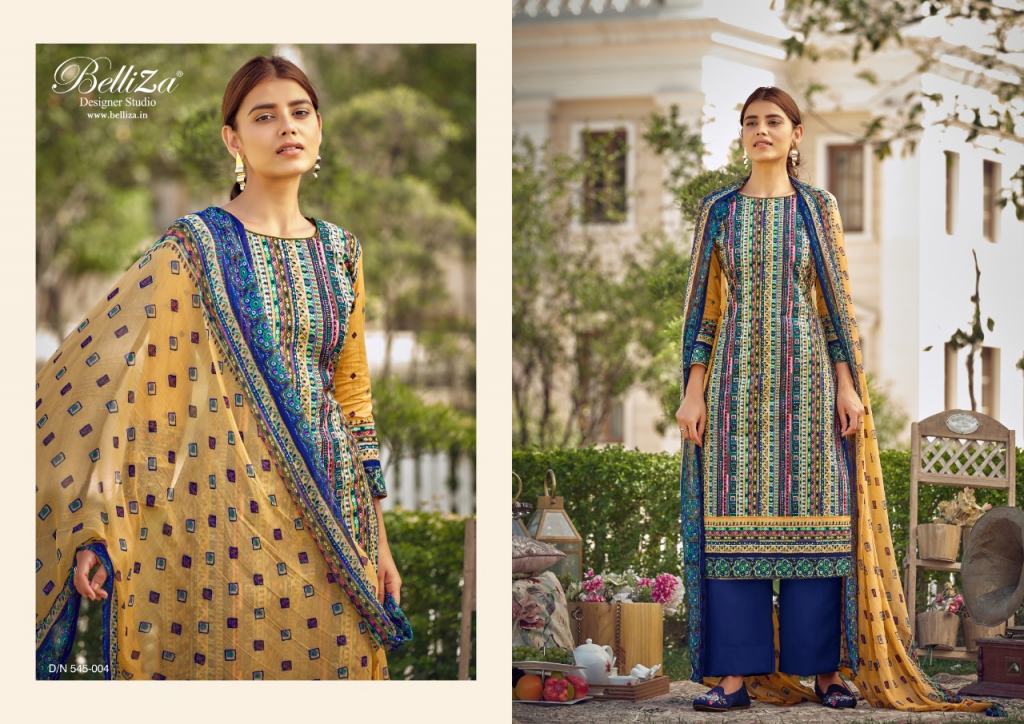 Belliza Melisa Designer Dress Material catalog, this catalog fabric is pure cotton digital print 2.50 mtr and bottom fabric is pure cotton 3.00 mtr and dupatta fabric is exclusively printed nazneen chiffon 2.30mtr.