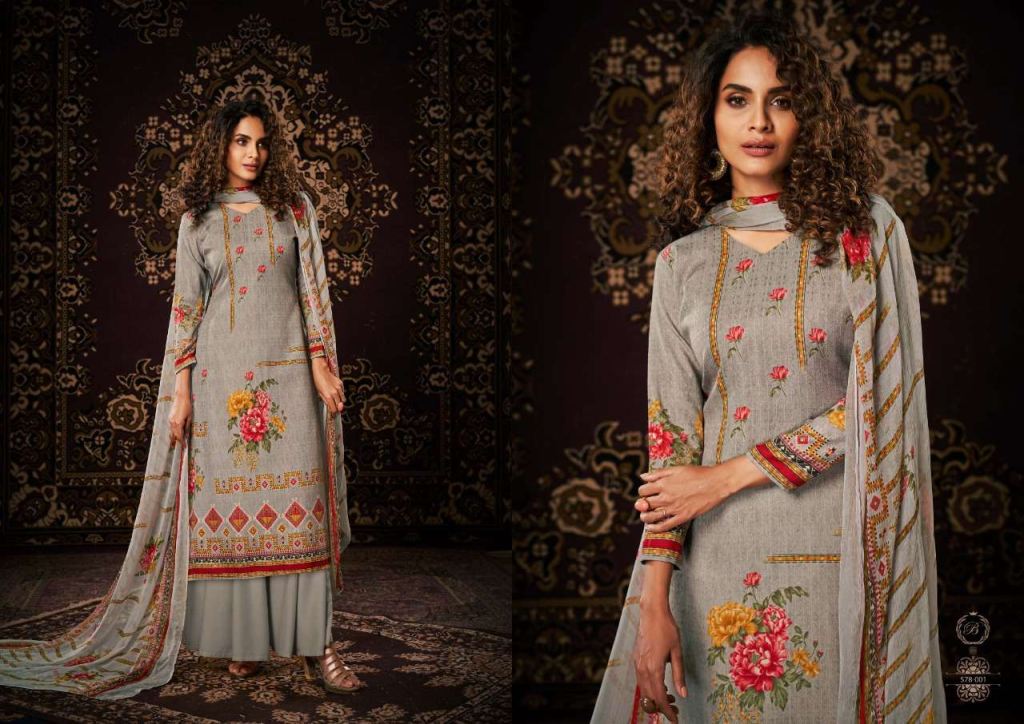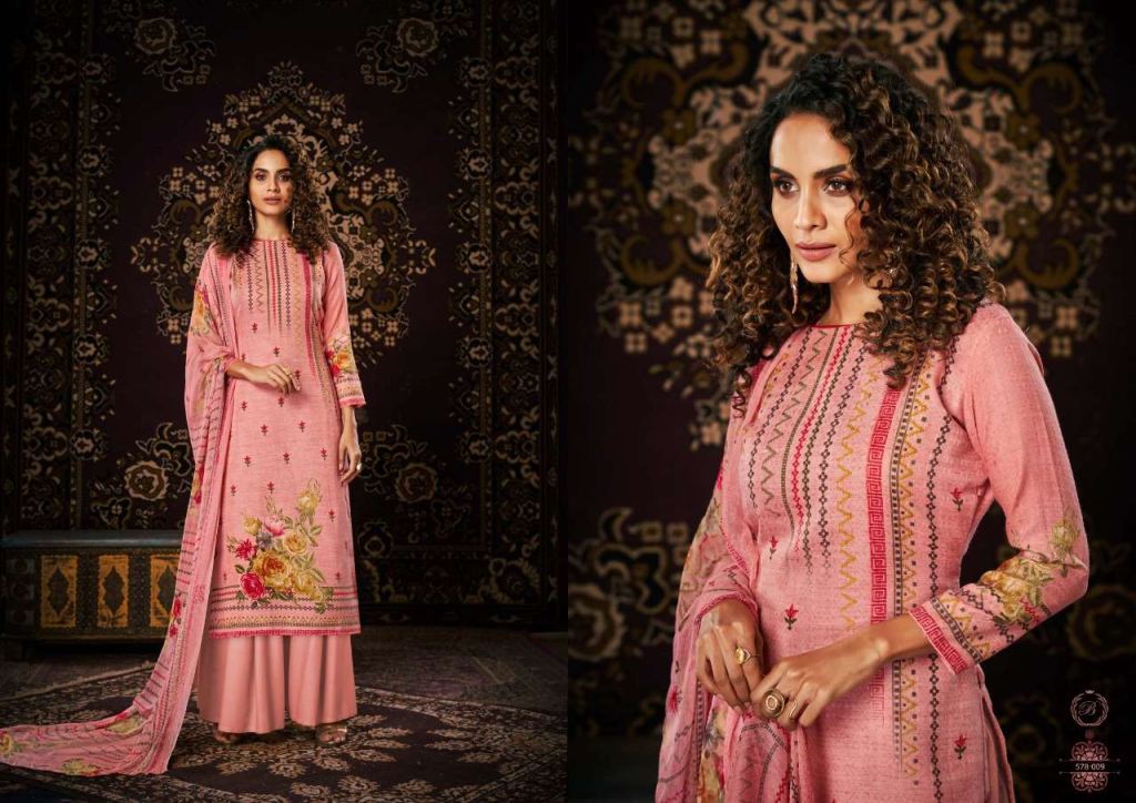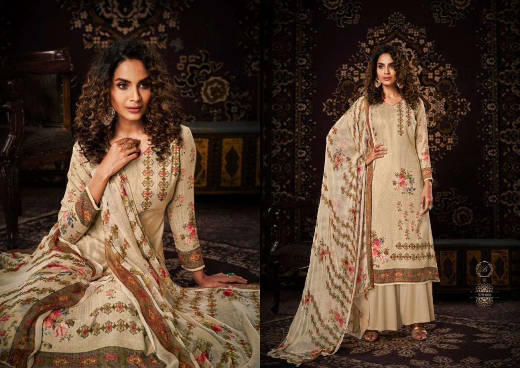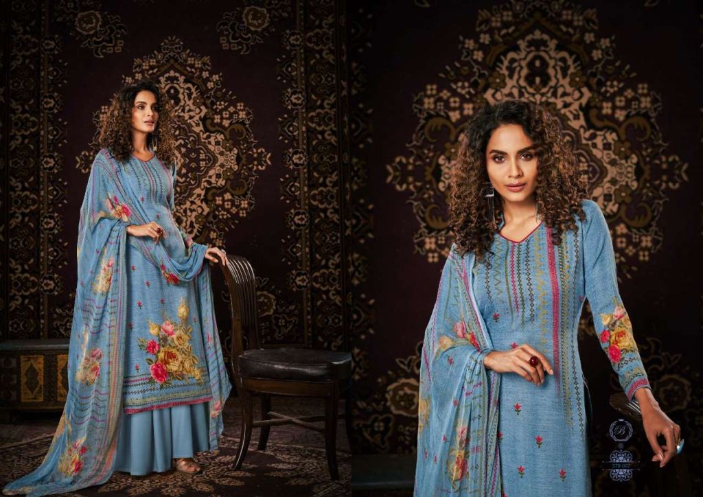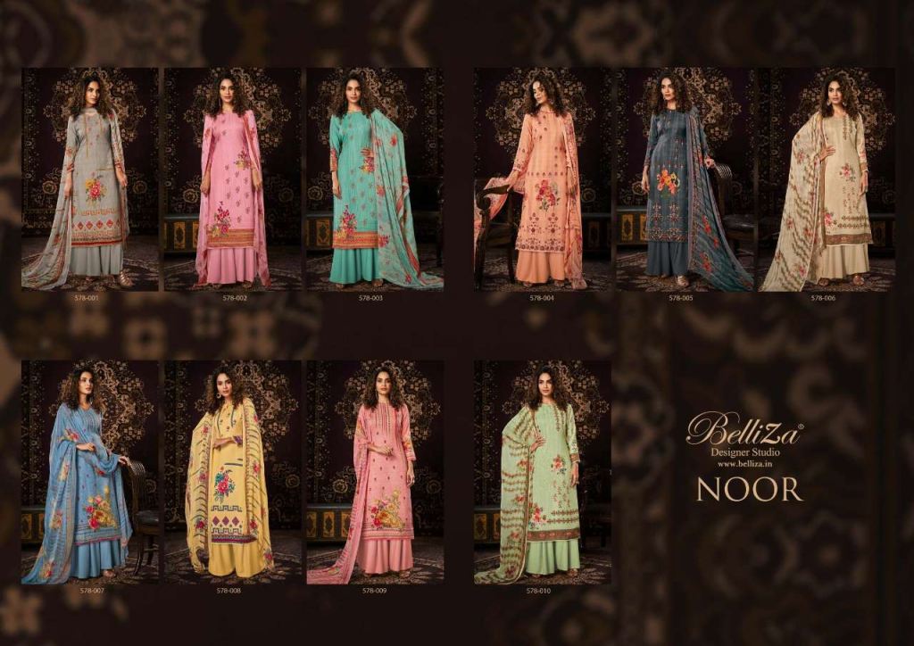 Belliza Noor Pure Pashmina Digital Print Dress Material Catalog, this catalog fabric is 100% Pure Pashmina Digital Print. (2.50 Mtrs) and the bottom fabric is Pure Pashmina Spun (3 Mtrs) with dupatta fabric is 100% Pure Bemberg Pure Dupatta (2.30 Mtr).