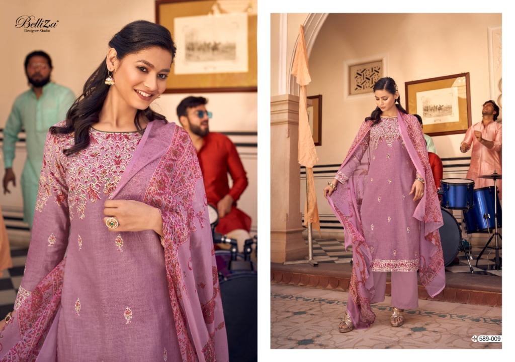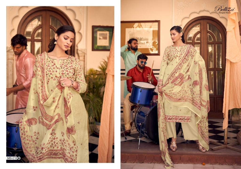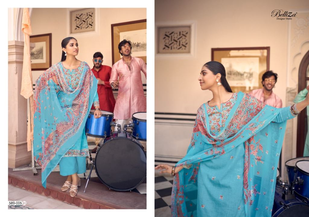 Belliza Vanya Exclusive Wear Designer Dress Materials Catalog. This catalog fabric is Top: Pure Cotton Linen with Digital Print (2.50 Mtr) | Dupatta: Pure Nazneen Chiffon (2.30 Mtr) | Bottom: Pure Cotton Salwar (3 Mtr).