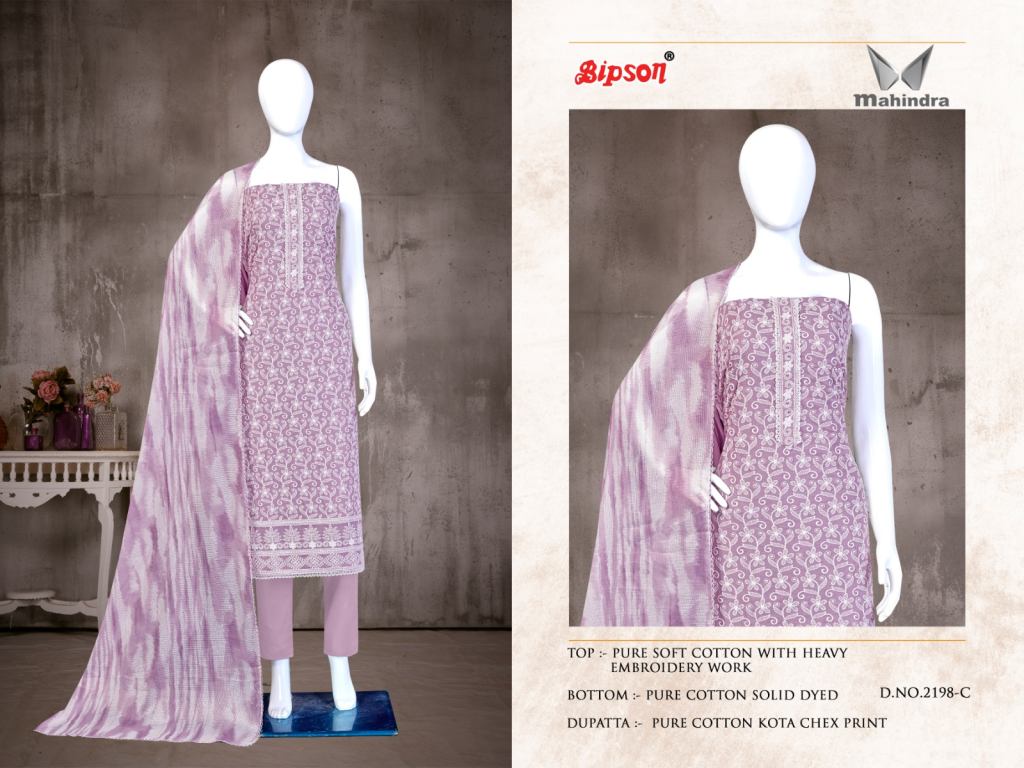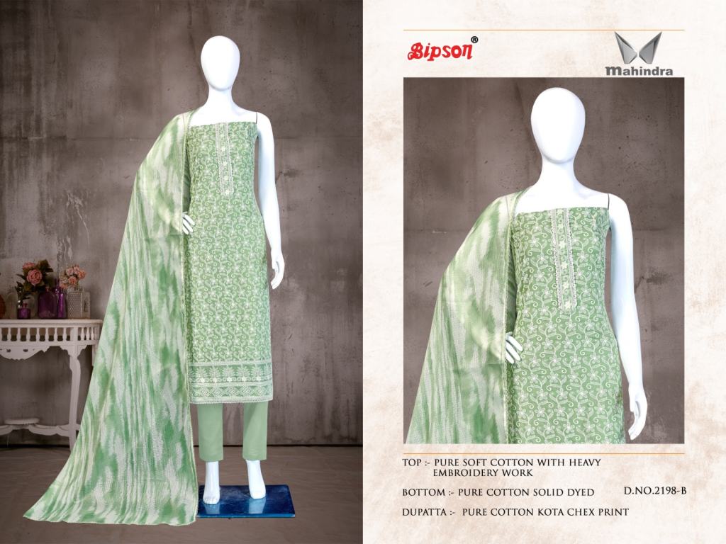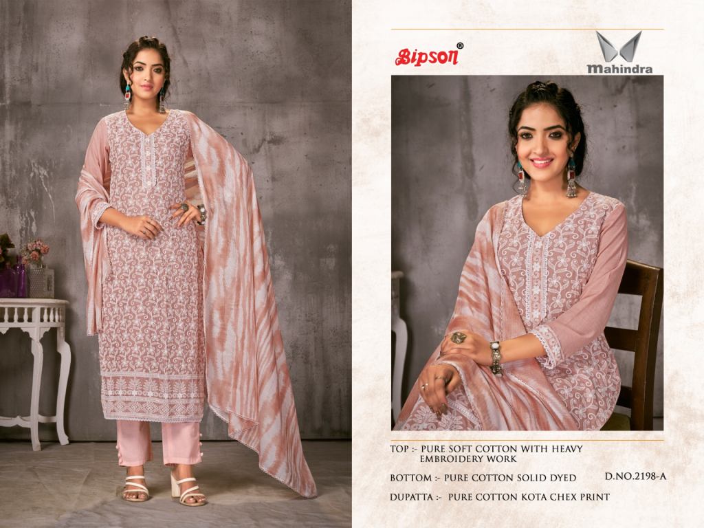 Bipson Mahindra 2198 Soft Cotton Embroidery Dress Material Collection, this catalogue fabric is Soft Cotton With White Thread Embroidery Work 2.5 MTR and the Bottom fabric is Cotton Solid Dyed 2.7 MTR with Dupatta fabric is Cotton Kota Chex Print 2.25 MTR.