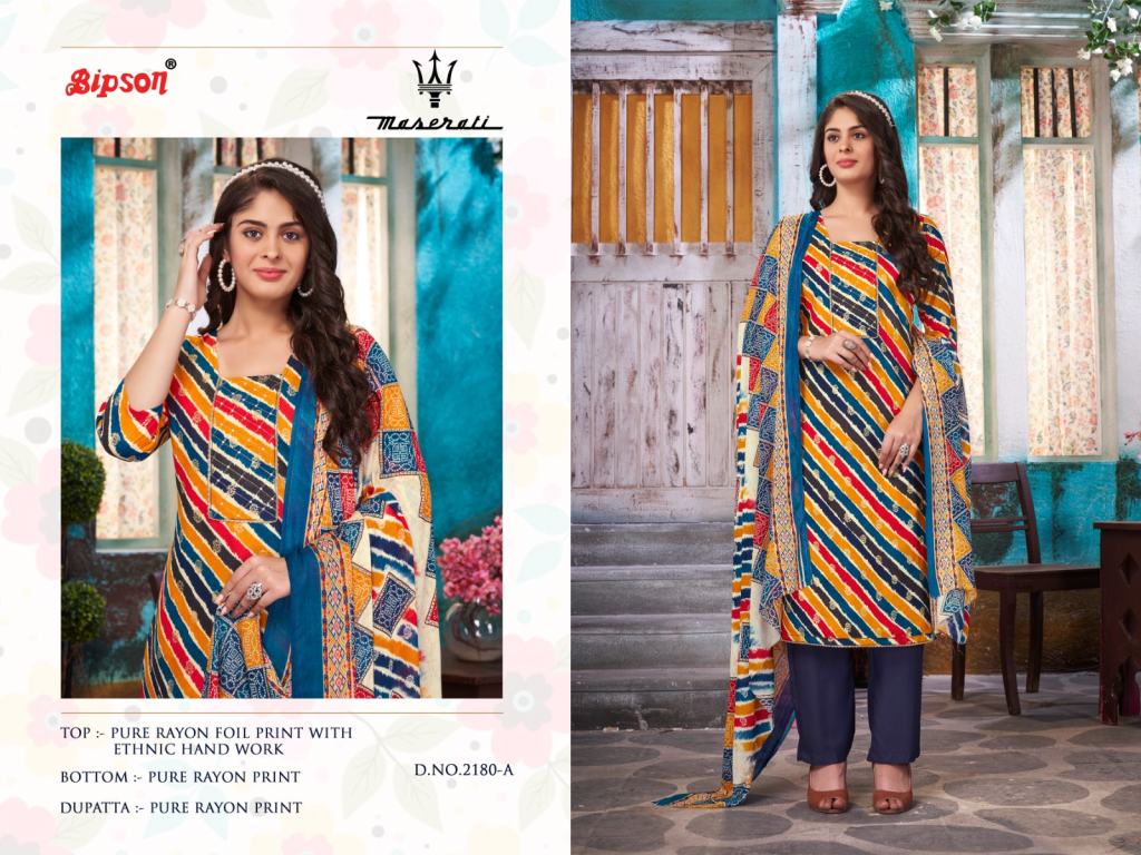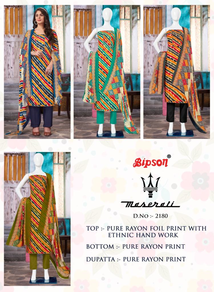 Bipson Maserati 2180 Daily Wear Rayon Printed Dress Materials. Top: Rayon Foil Print With Ethnic Hand Work | Bottom: Rayon Print | Dupatta: Rayon Print