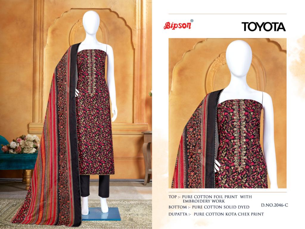 Bipson Toyota 2046 Designer Cotton Dress Material Collection, This catalogue fabric is Cotton Foil Print with Embroidery Work and the Bottom fabric is Cotton Solid Dyed with Dupatta fabric is Cotton Kota Chex Print and diffrent colours also.