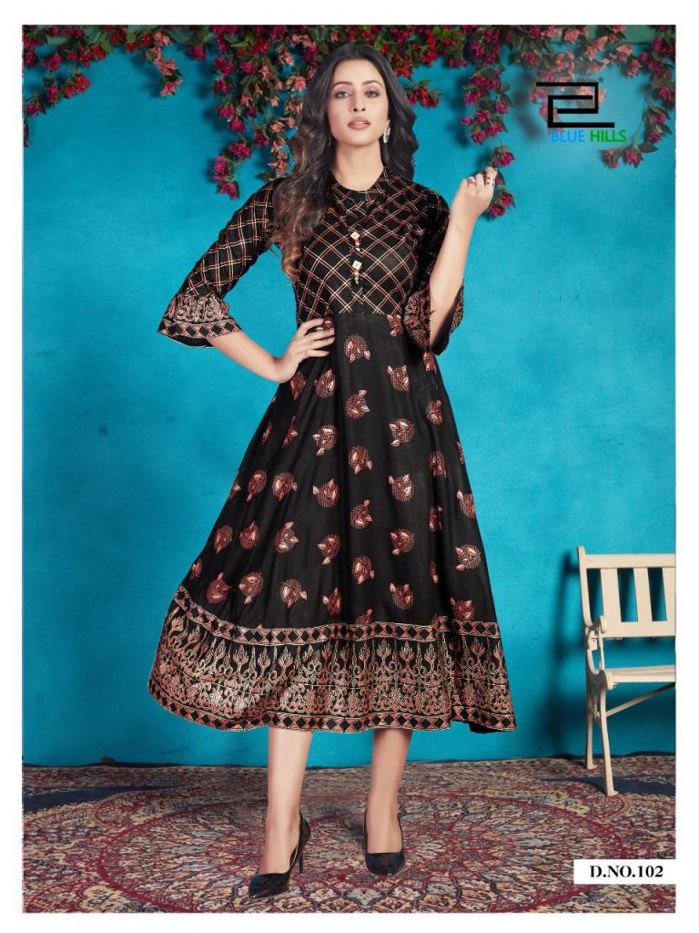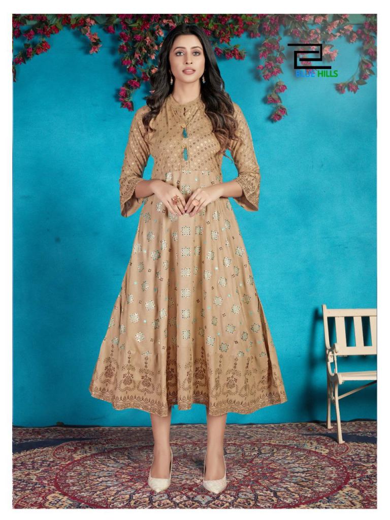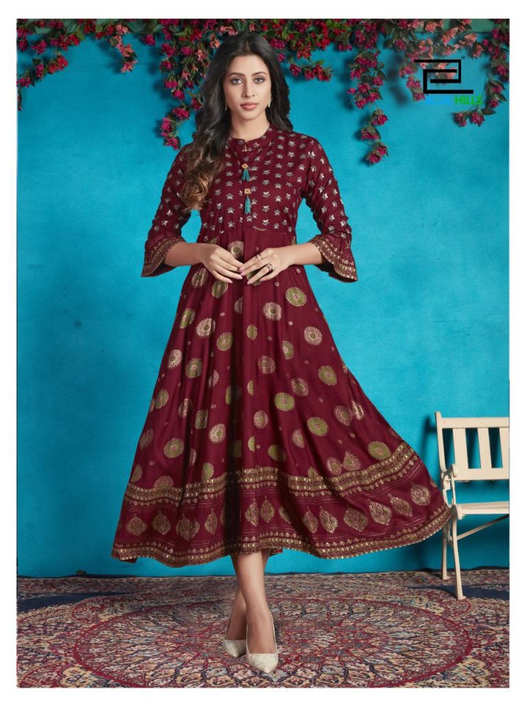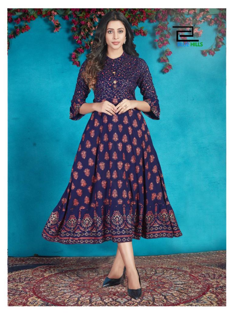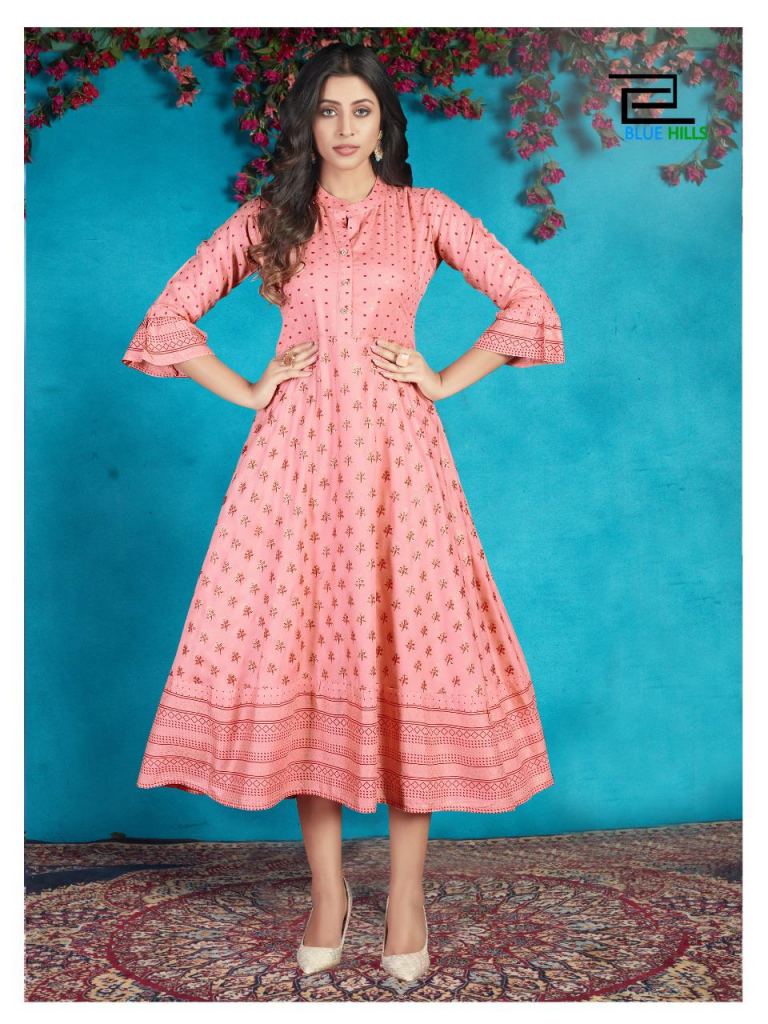 Blue Hills presents Classy Designer Kurti collection, this catalogue fabric is rayon and this catalogue is Kurtis that are very fine look with some designs in full of the fabric, this catalogue is Anarkali types Kurtis Rayon print & plain with four various types of colour and designs.