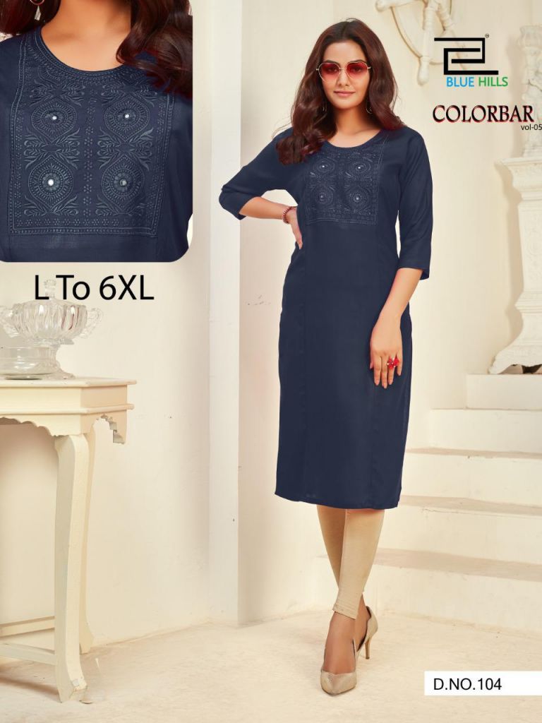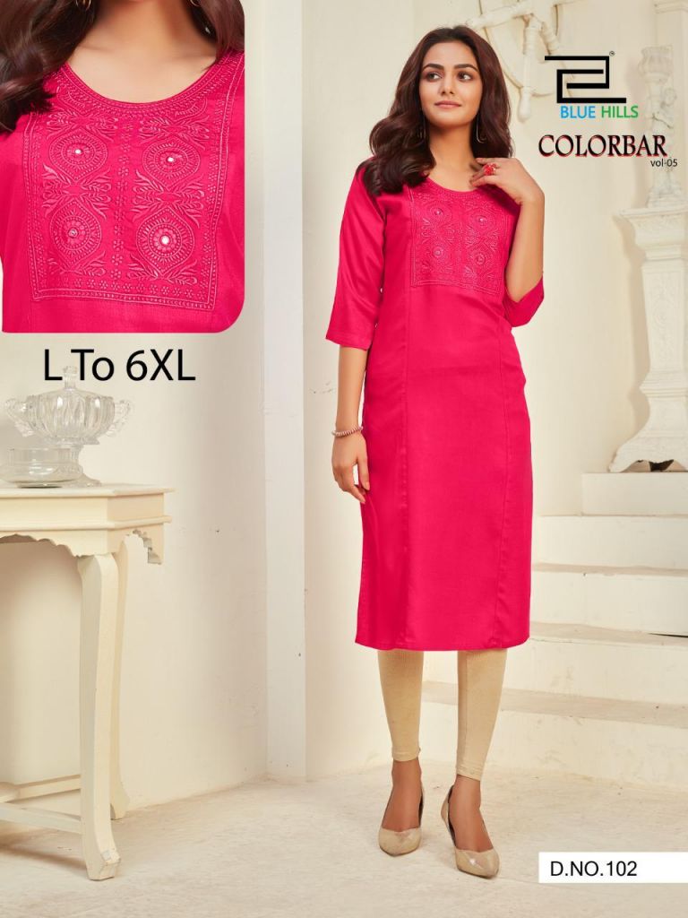 Blue Hills Color Bar vol 5 Designer Embroidery Kurti catalog, this catalog fabric is Rayon and this catalog design is little with pattern will be various. Casual Wear Kurti Collection.