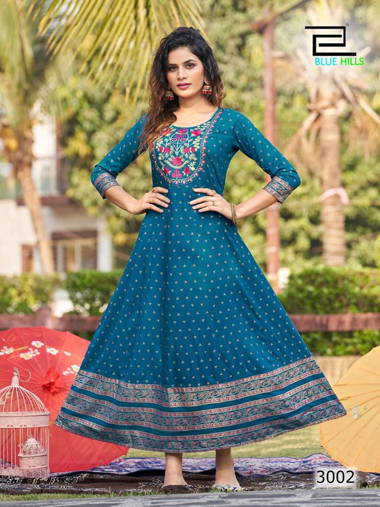 Blue Hills Encounter Vol 3 Stylish Long Anarkali Kurti Collection. this set kurti fabric Rayon Foil Print with Embroidery. (Length: 52")