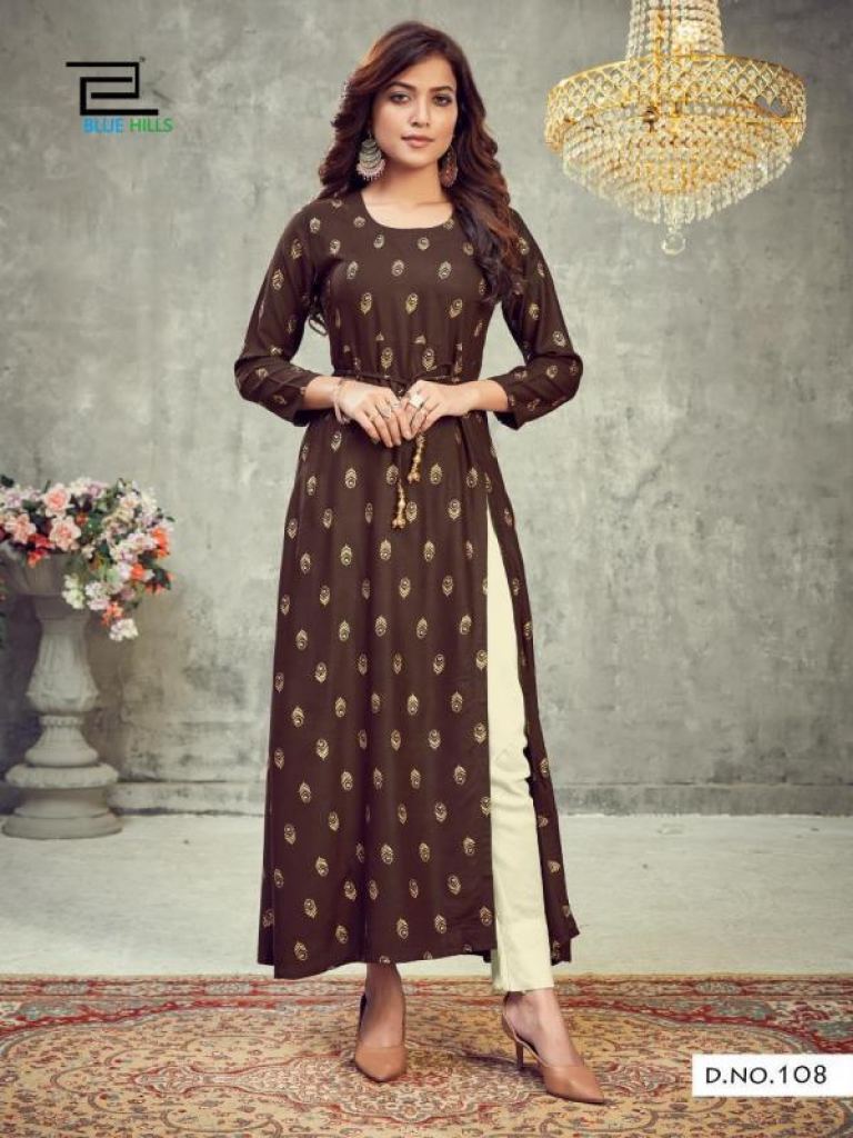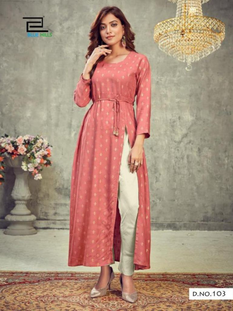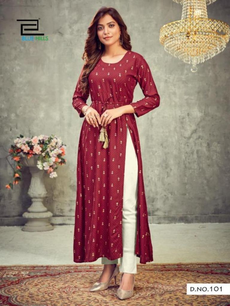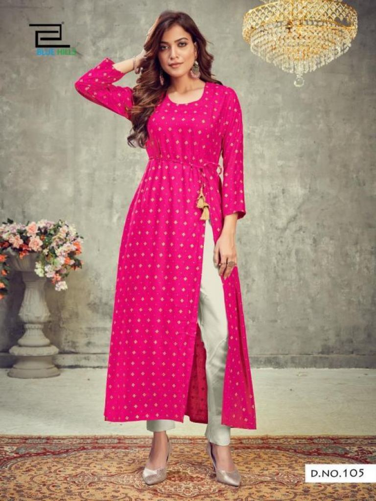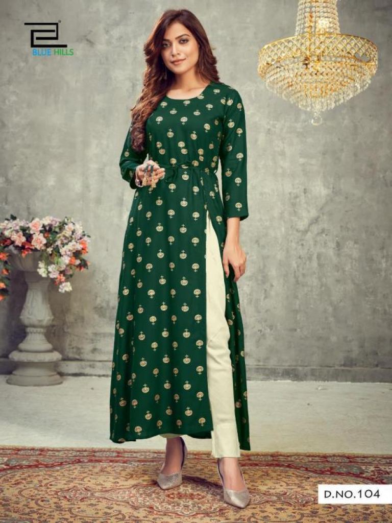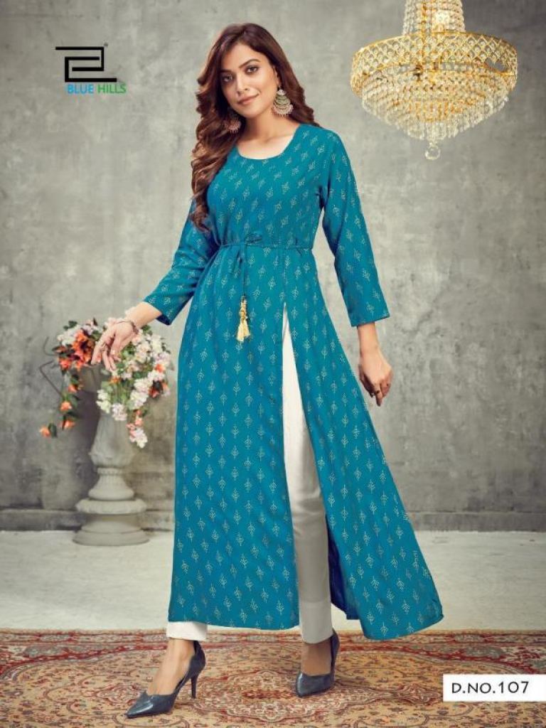 Blue Hills First Date vol 1 Fancy Rayon Side Slit Kurti catalog, this catalog fabric is 14 Kg Rayon Print | Length: 50" | Center Belt and this catalog design are different with different colors and Rayon print & plain with four various types of color and designs.