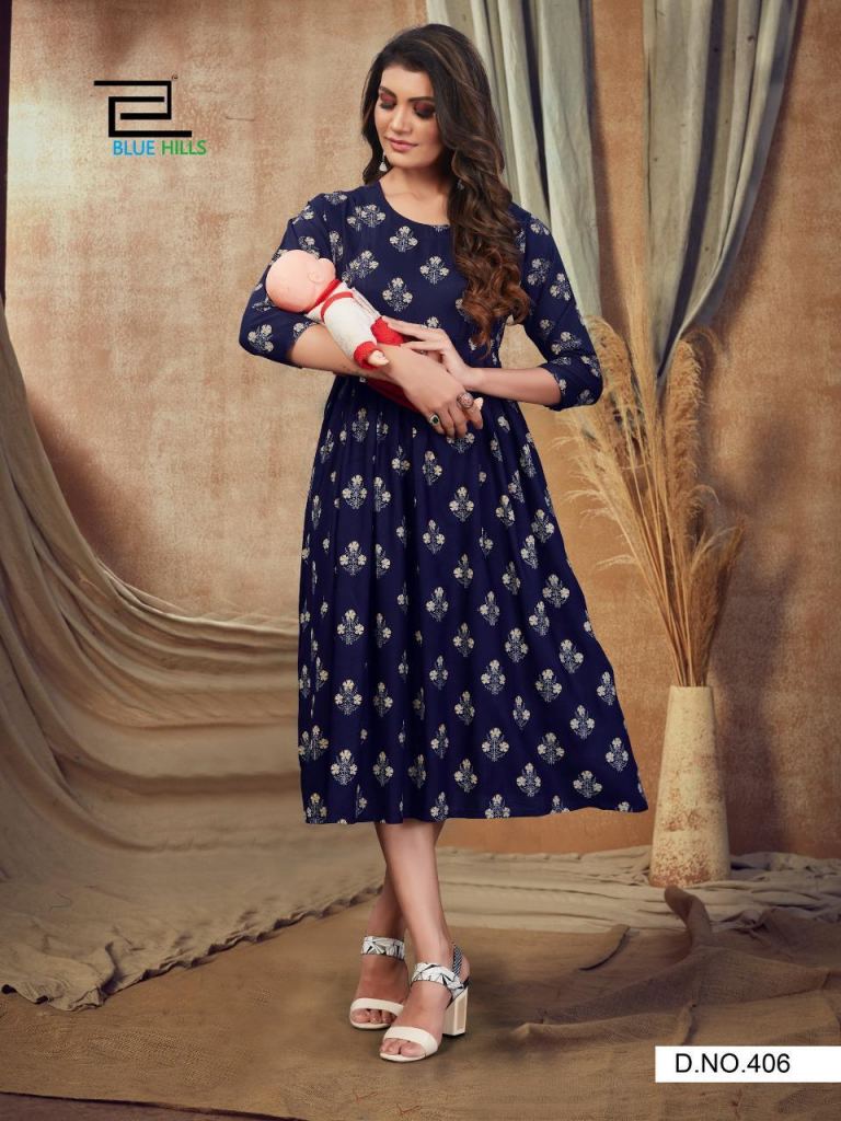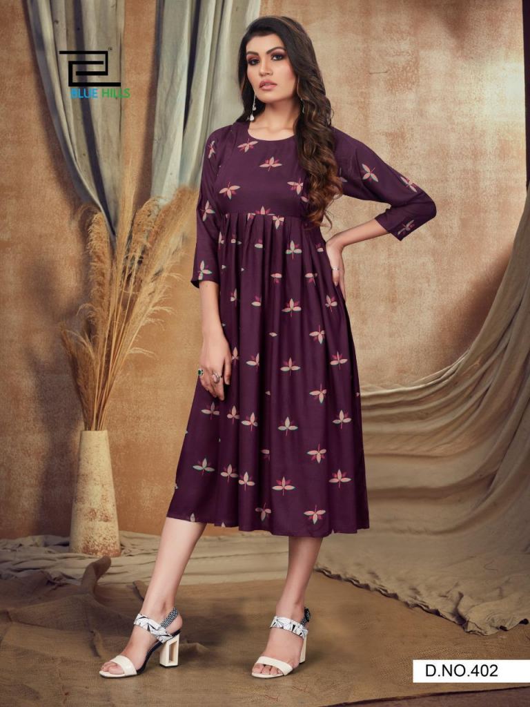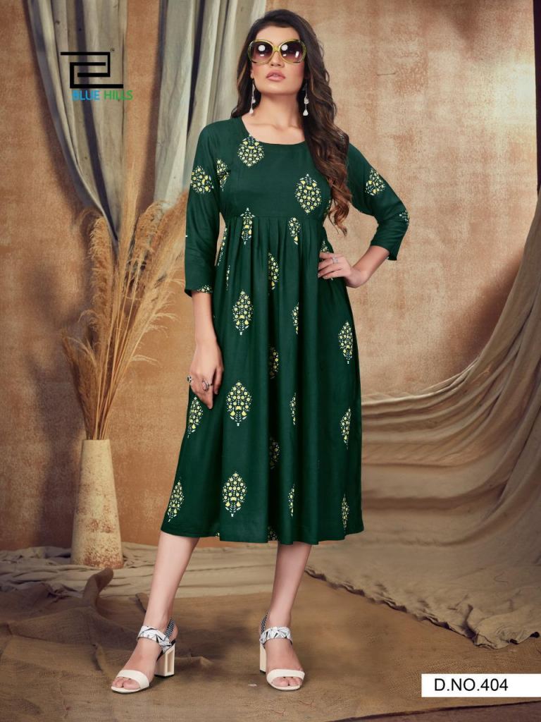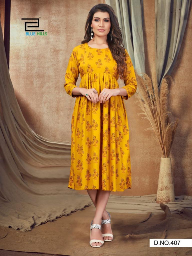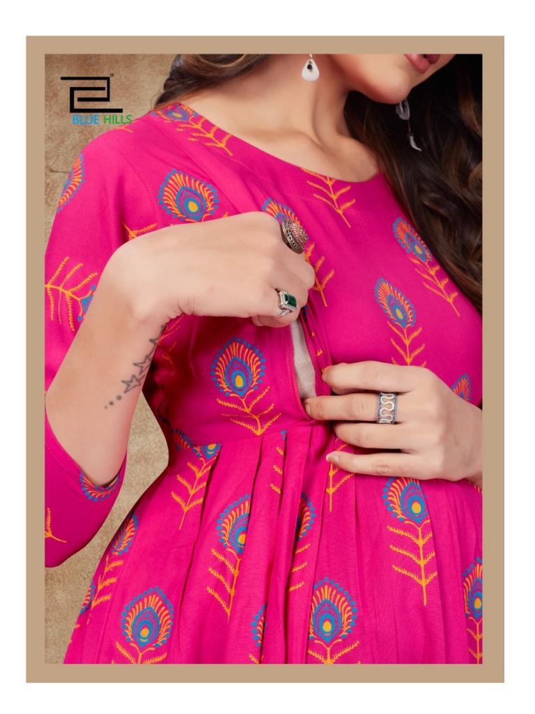 Blue Hills Good News vol 4 Rayon Printed Kurti catalog, this catalog fabric is rayon and Rayon Print Style: A-line with frill Sleeves: 3/4 sleeves Length: 45 (Approx) and very fine to look and designs amazing.