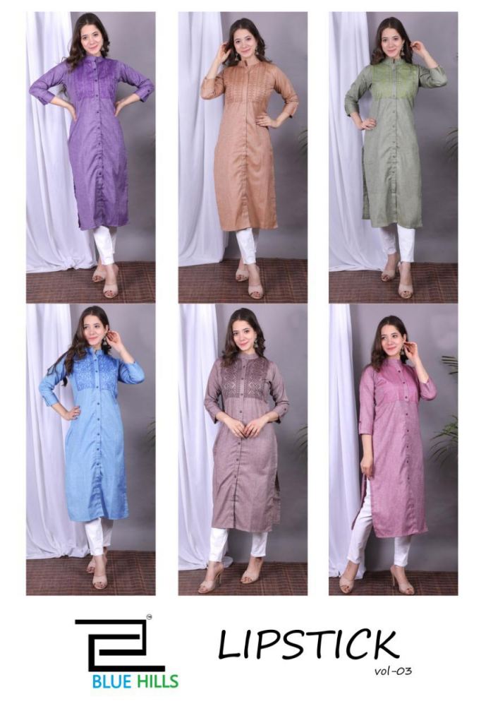 Blue Hills Lipstick Vol 3 Kurtis In Surat Wholesale, this catalog fabric is cotton and this catalog are different color with different designs and this catalog are amazing Kurti collection with Kurti in neck part in button this catalog is a half sleeve with catalog are super Kurtis collection in surat wholesale rate.