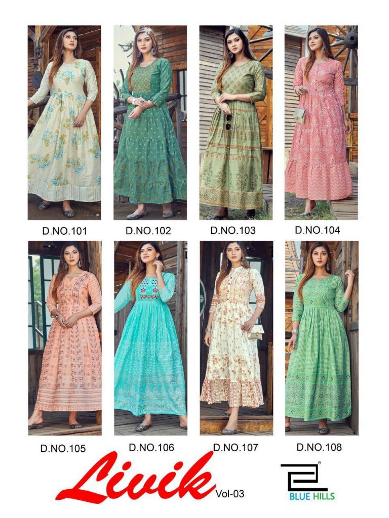 Blue Hills Livik Vol 3 Anarkali Kurtis: Buy Anarkali Kurtis Online at Best Prices, this catalog fabric is cotton and very fine look is so beautiful collection with this catalog colors are uinuqe.