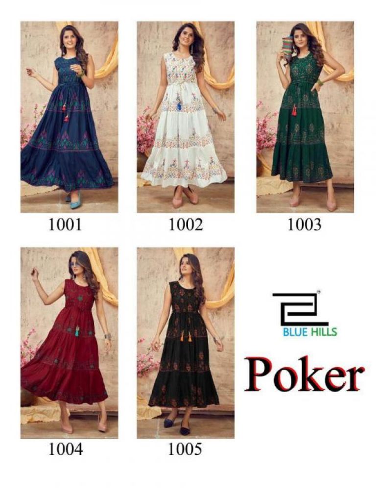 Blue Hills Poker Rayon Fancy Long Kurti Buy Designer Long Kurtis Online, this catalog fabric is rayon and this catalog total 5 design and this catalog design are amazing and colors are beautiful and fancy print all are also.
