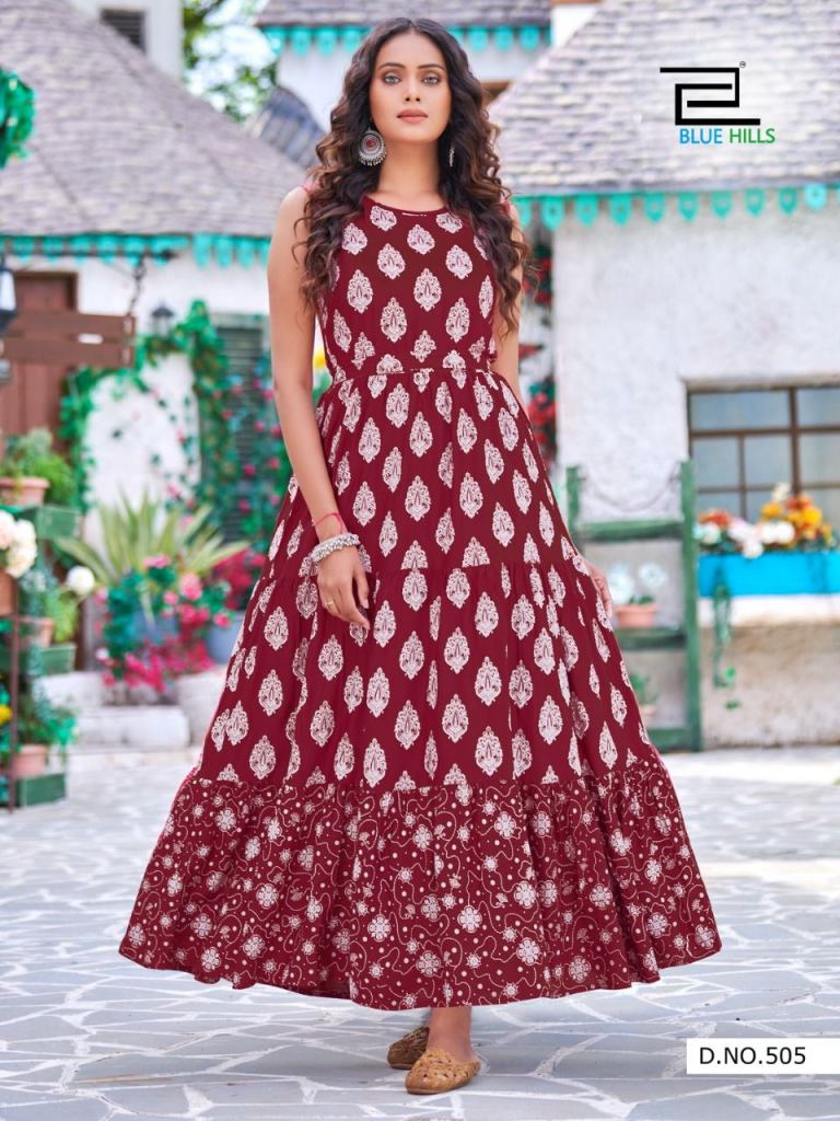 Blue Hills Sun Shine vol 5 Anarakli Long Kurti Catalog, this catalog top fabric is RAYON PRINT 14KG With Same Fabric Belt With Accessories (Half Sleeve Attach Inside) | Length: 50 - 52 and different colors and different designs.