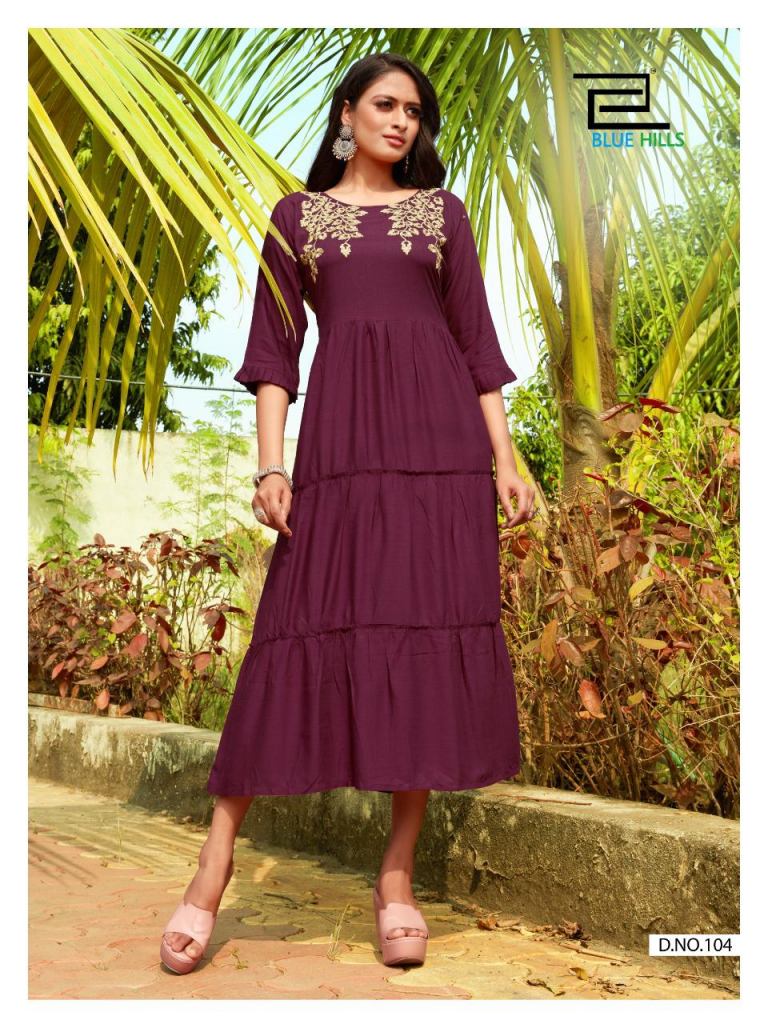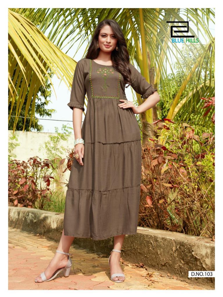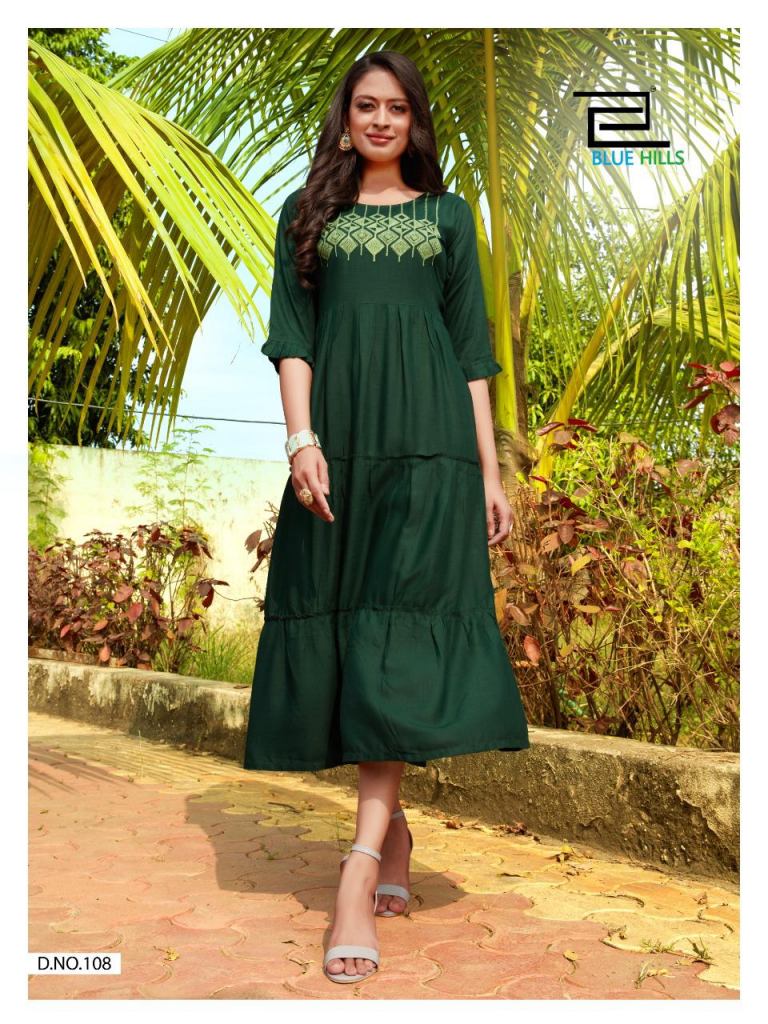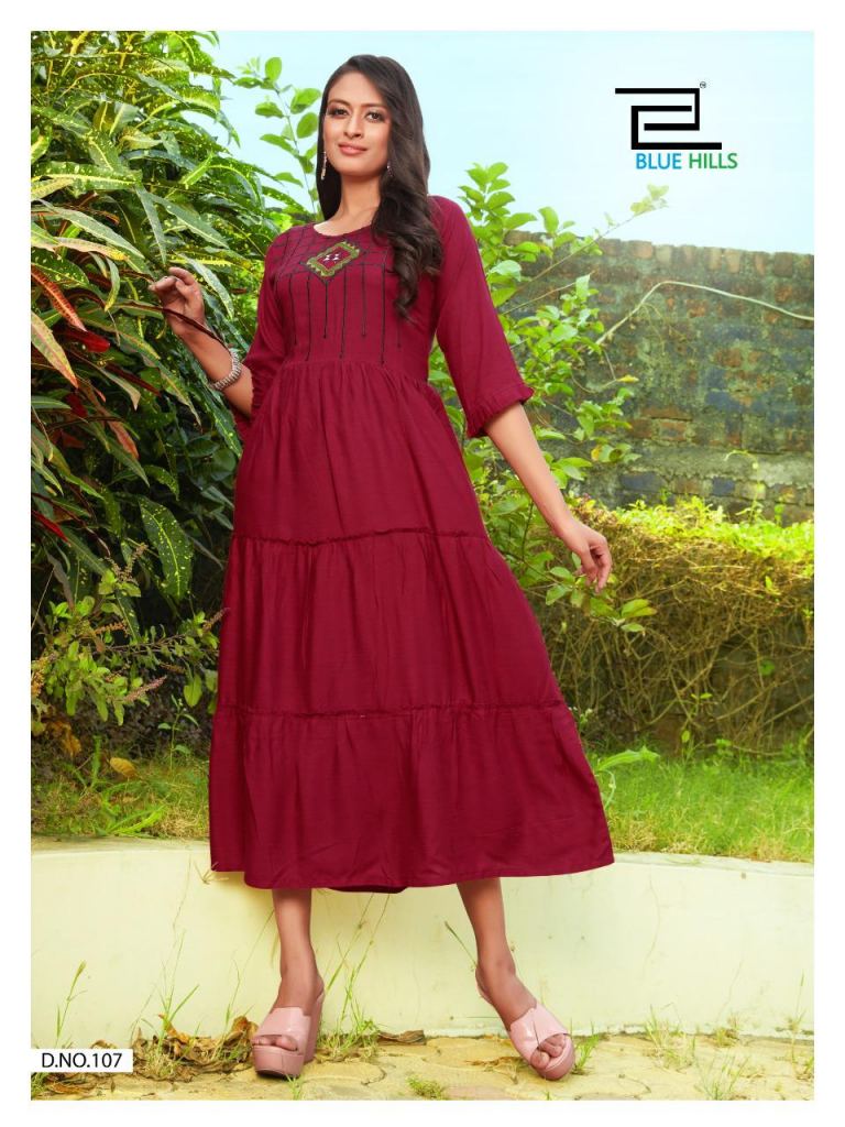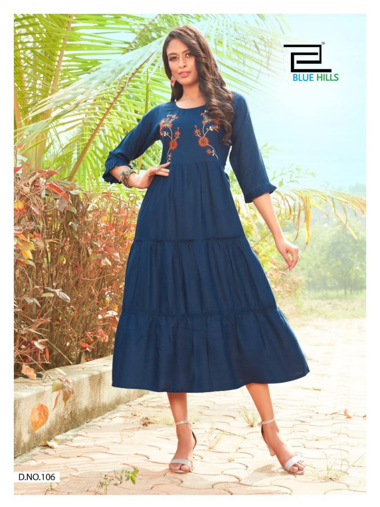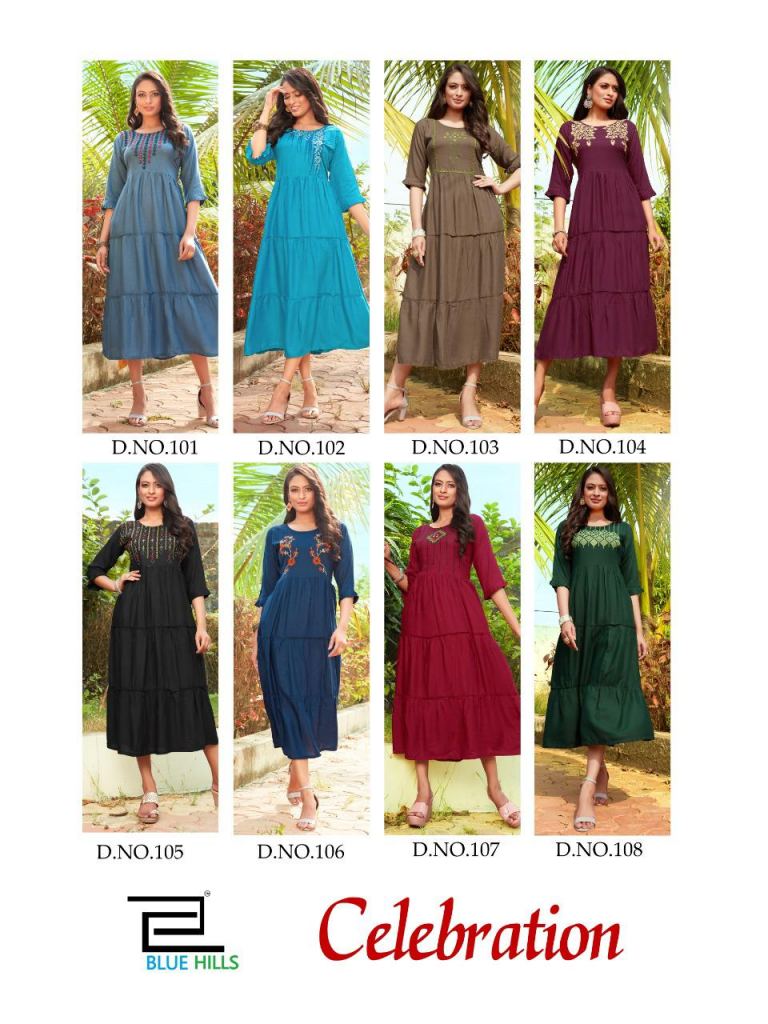 Blue Hils presents Celebration vol 1 Designer Kurtis Collection, this catalog fabric is Heavy Rayon slub and embroidery work with the design are neck part and that are some of the single side and some of the full part. this catalog is very fine designs in Kurtis and color all are dark in color.