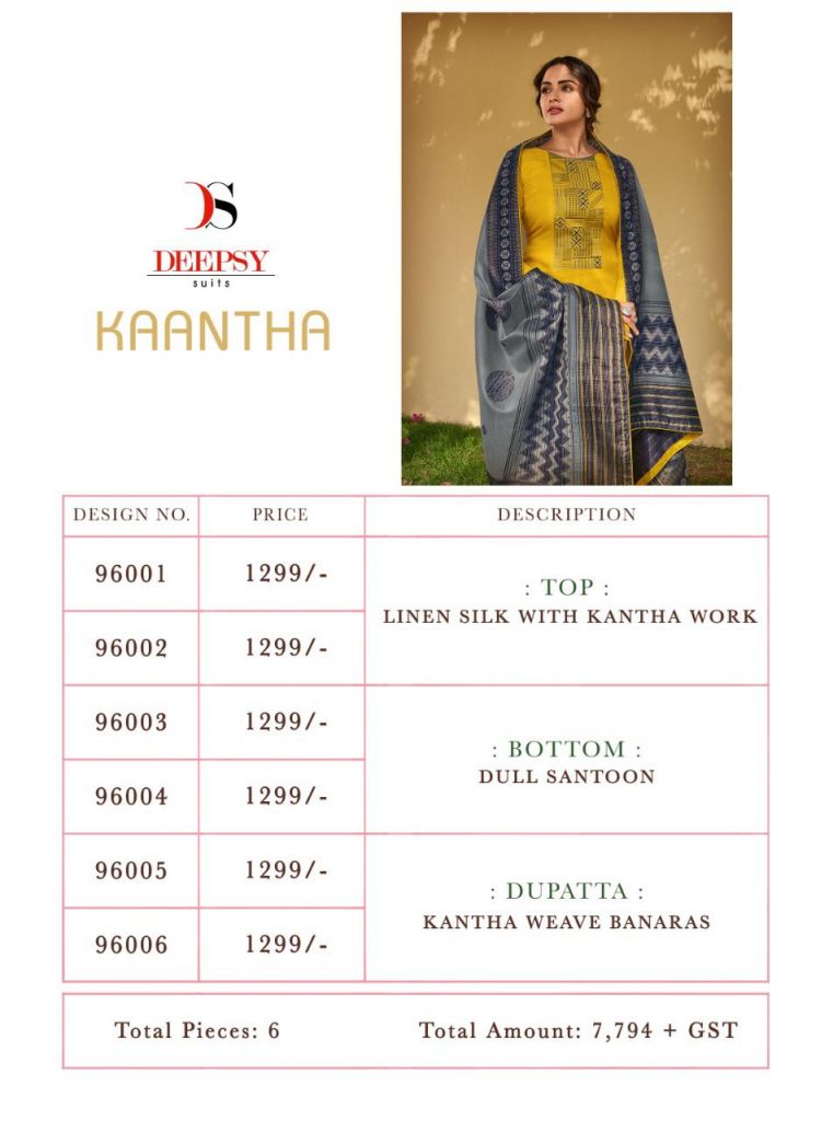Deepsy presents Kaantha Ethnic Wear Designer Dress Material, this catalog top is linen silk with kantha work and the bottom is dull santoon and the dupatta is kantha with weave banarasi and this catalog design is amazing.