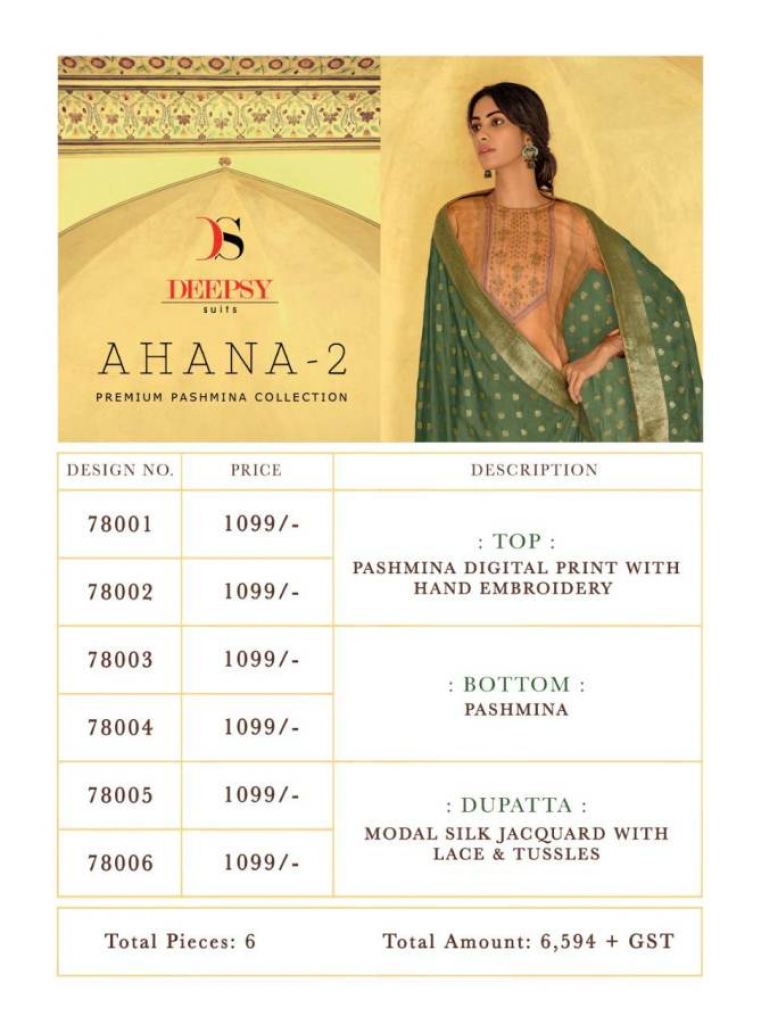 Deepsy Presents Ahana vol 2 Designer Dress Material, this catalog fabric is pashmina with