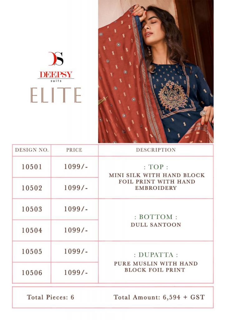 Deepsy presents Elite Designer Dress Material, this catalog top fabric is Mini silk with hand block foil print with handwork embroidery and this catalog bottom are Dull santoon this catalog dupatta fabric is Pure Muslin silk with hand block foil print the collection is super color and designs then dress material are different catalog.