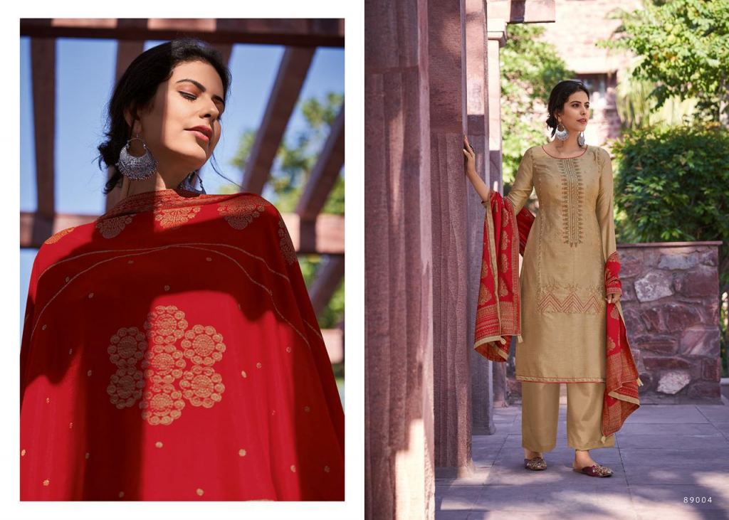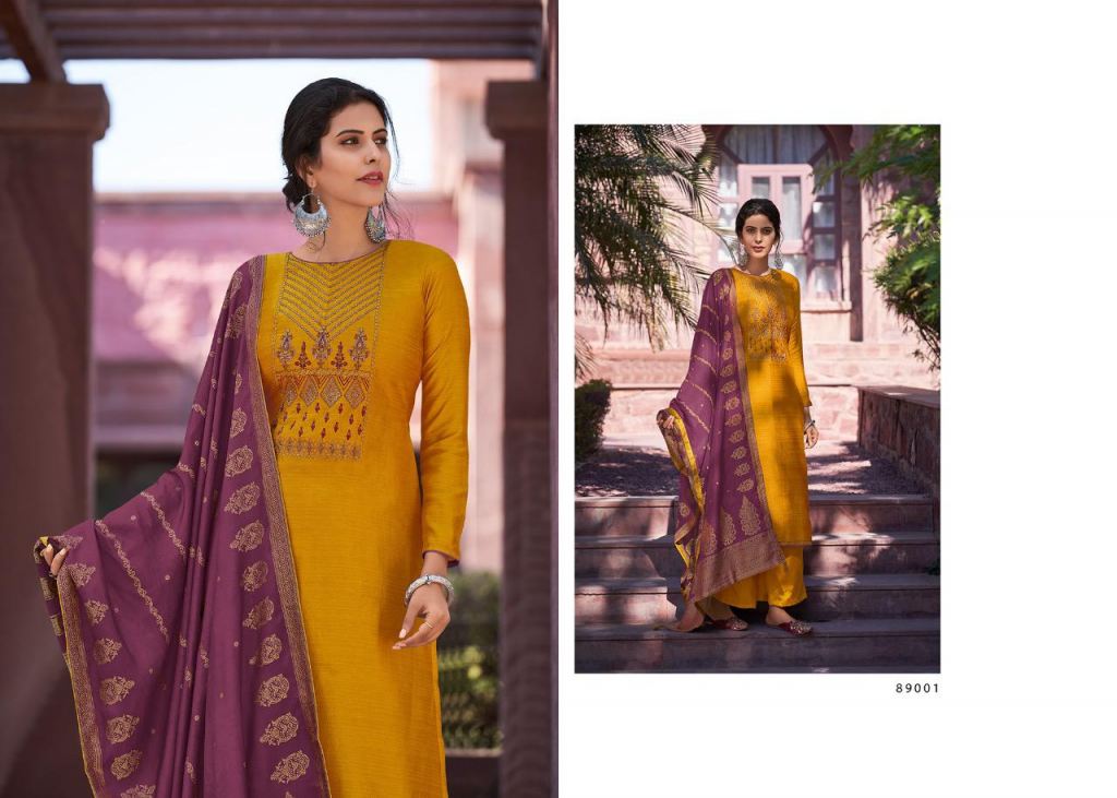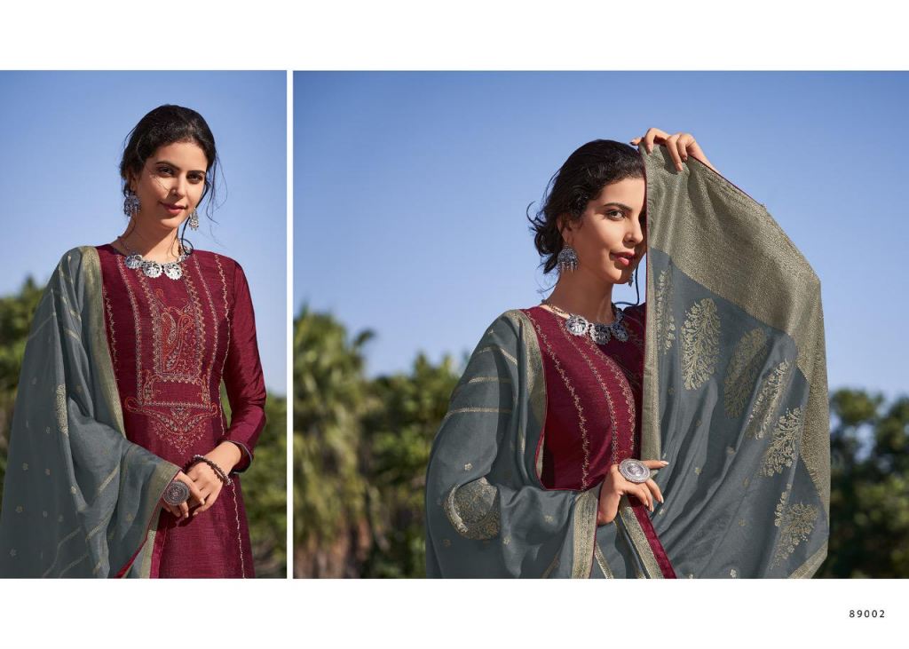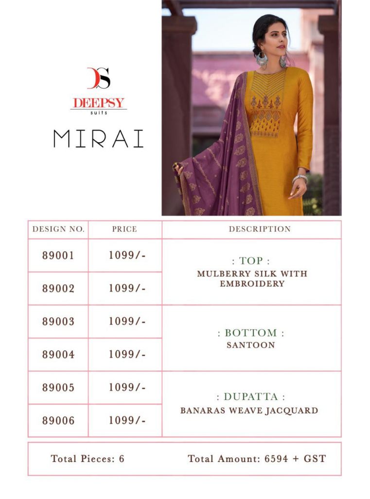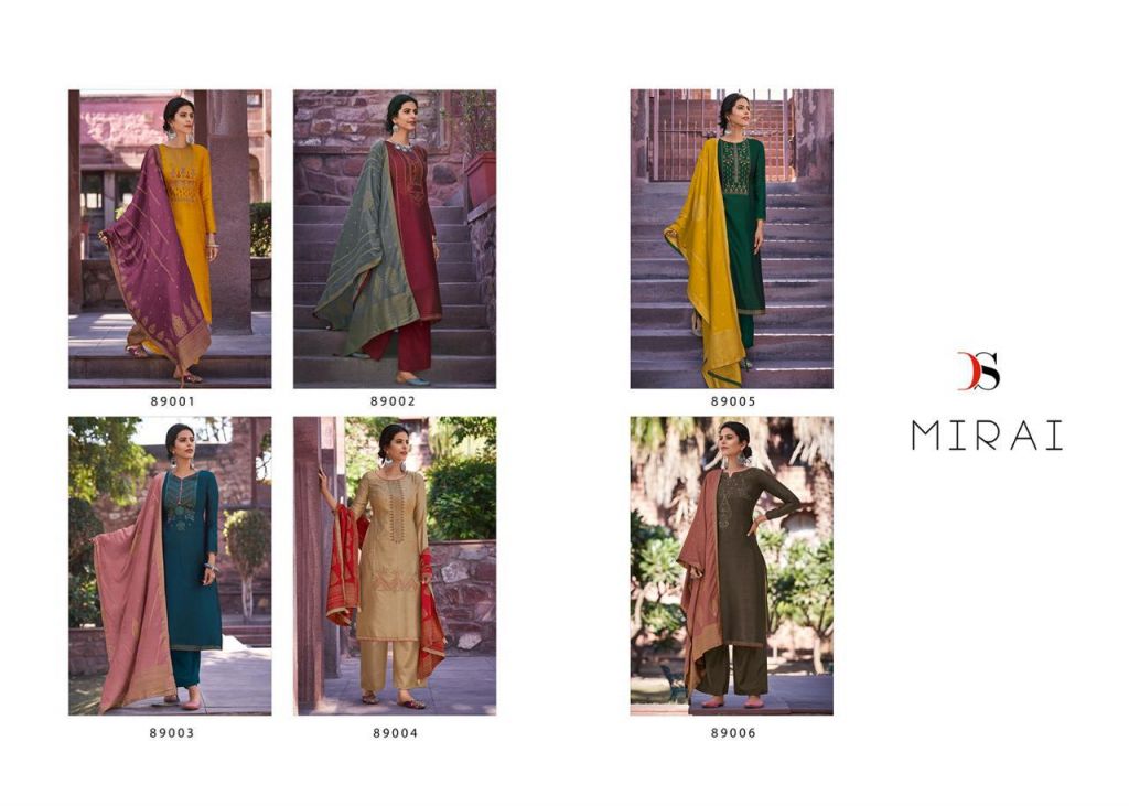 Deepsy presents Mirai Ethnic Wear Dress Material Collection, this catalog design is an attractive embroidery work design in different colors this catalog top is Mulberry silk with embroidery work and the bottom is santoon and dupatta is banarasi weave jacquard fore side lace.
