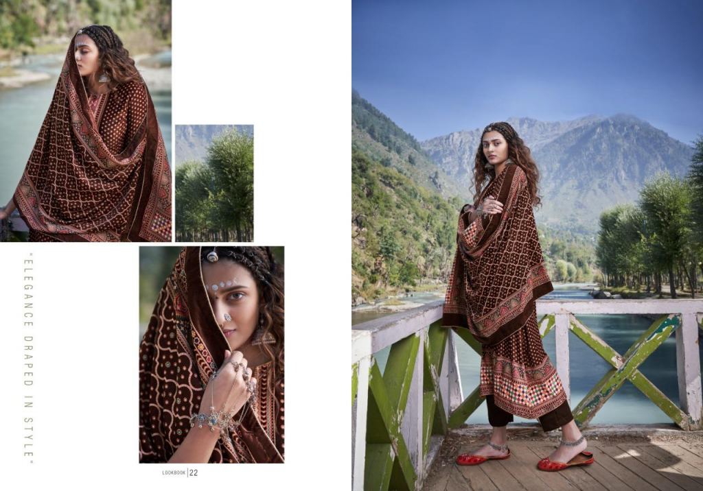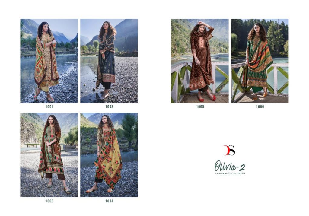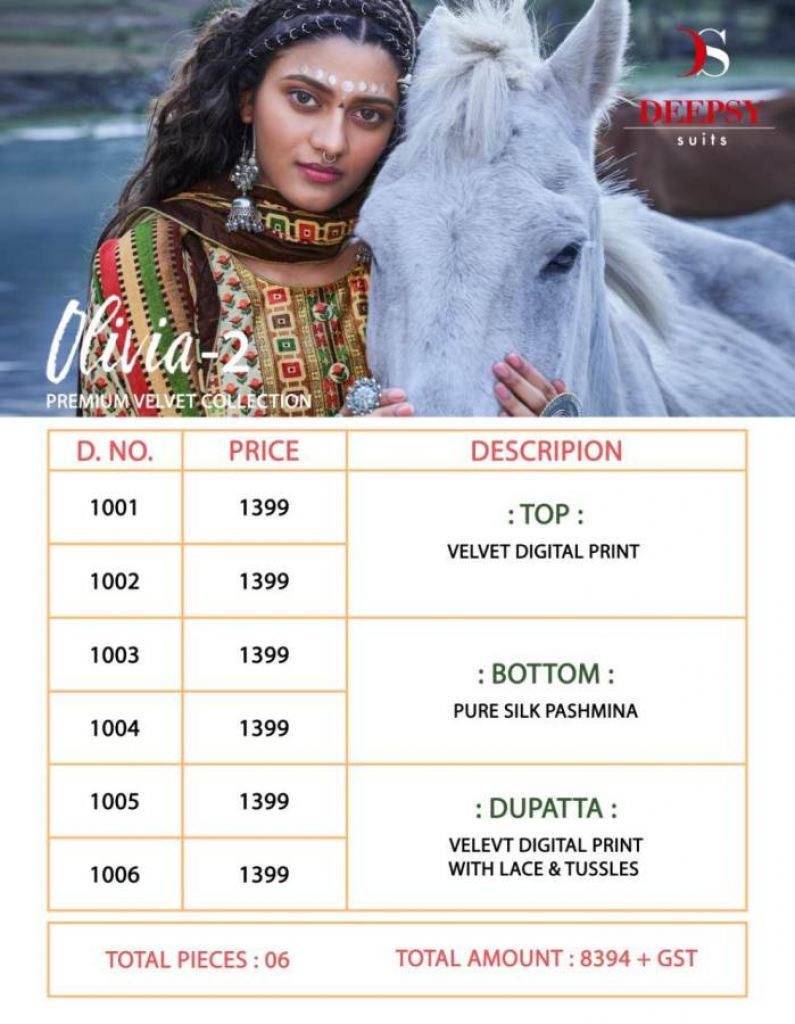 Deepsy presents Olivia vol 2 Pakistani Collection, this catalog top is Velvet digital print and bottom pure silk pashmina and dupatta is velvet digital print with lace &tussles and this catalog with different attractive printed design in different colors.