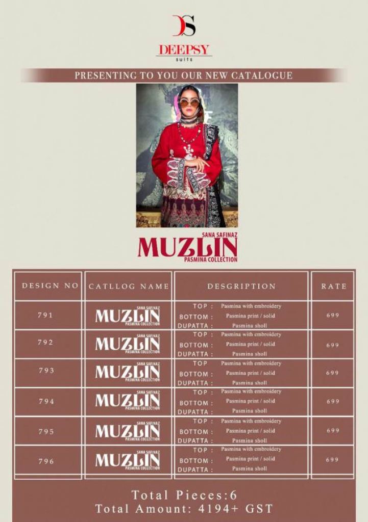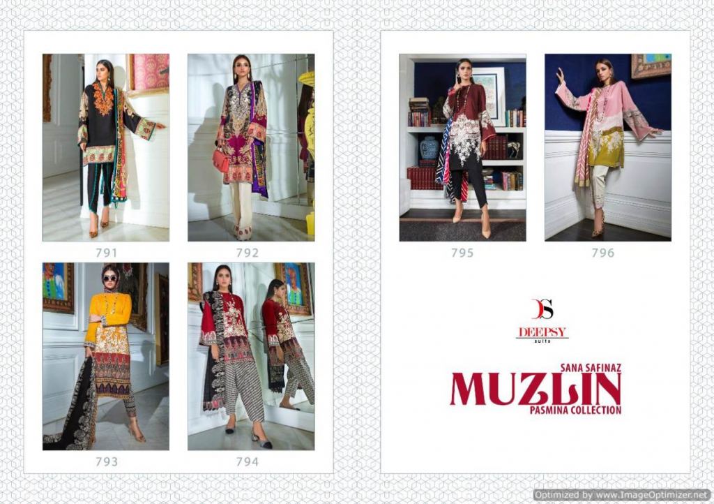 Deepsy presents Sana Safinaz Muzlin Pakistani Suits Collection, this catalog fabric is pashmina and this catalog top is pashmina with exclusive embroidery work and bottom with dupatta are pashmina fabric and this catalog is a different typical pattern with color combination and designs are different.