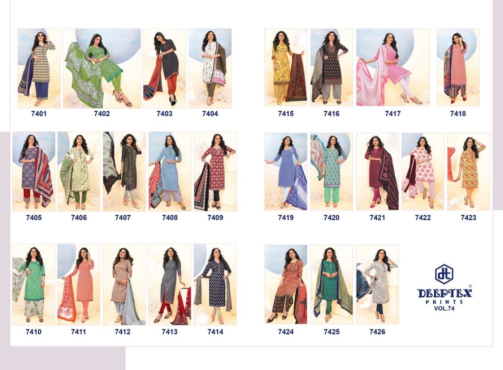 Deeptex Miss India vol74 Cotton Printed Drees Material Collection, this catlog fabric is Cotton Print (2.50 Mtr) with Bottom fabric is Cotton Print (2.0 Mtr) and Dupatta fabric is Cotton Print (2.25 Mtr) and fancy print also.