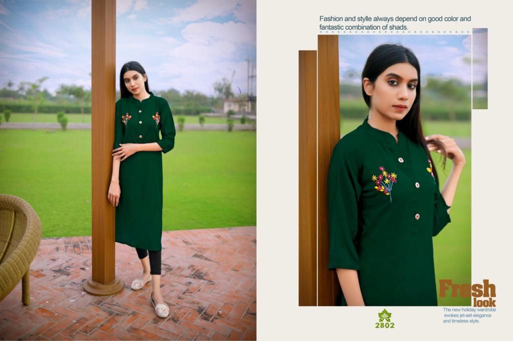 Fc presents Libaaz-2802 casual wear Kurtis collection, this catalog fabric is rayon and full inner and attractive green color and handwork also with set to set collection.