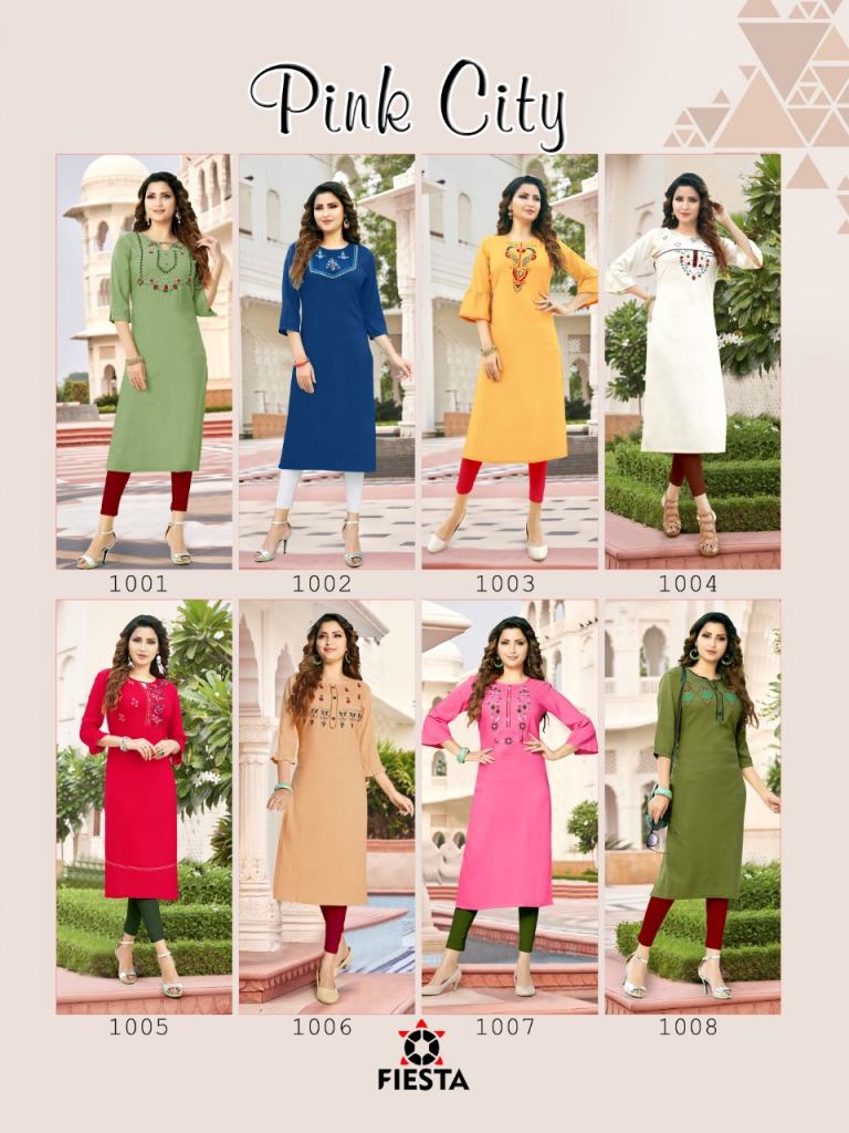 Fiesta Pink City Rayon Fancy Embroidery Kurti catalog, this catalog total eight different design and this catalog design are fancy with this catalog fabric is Rayon Slub with Work is Heavy Dhaga Handwork & Katha Work also.